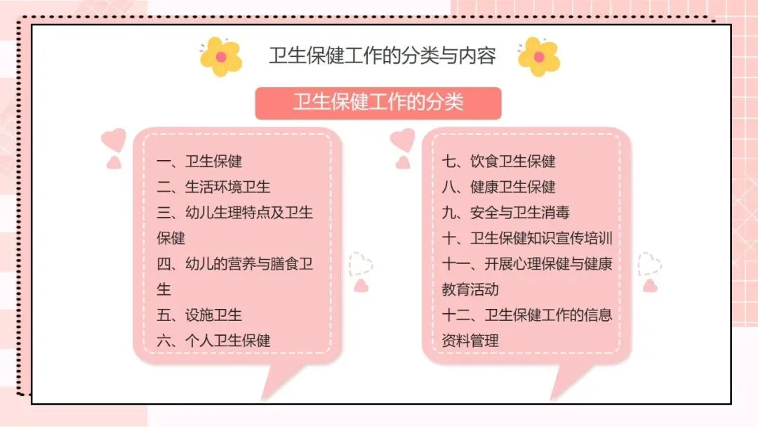 了解了方针和目的,我们进入第二部分,卫生保健工作的分类与核心内容。首先给大家梳理一下卫生保健工作的十二大分类,分别是卫生保健、生活环境卫生、幼儿生理特点及卫生保健、幼儿的营养与膳食卫生、设施卫生、个人卫生保健、饮食卫生保健、健康卫生保健、安全与卫生消毒、卫生保健知识宣传培训、开展心理保健与健康教育活动、卫生保健工作的信息资料管理。这十二类工作覆盖了幼儿园卫生保健的方方面面,彼此关联、缺一不可,需要我们协同推进。
