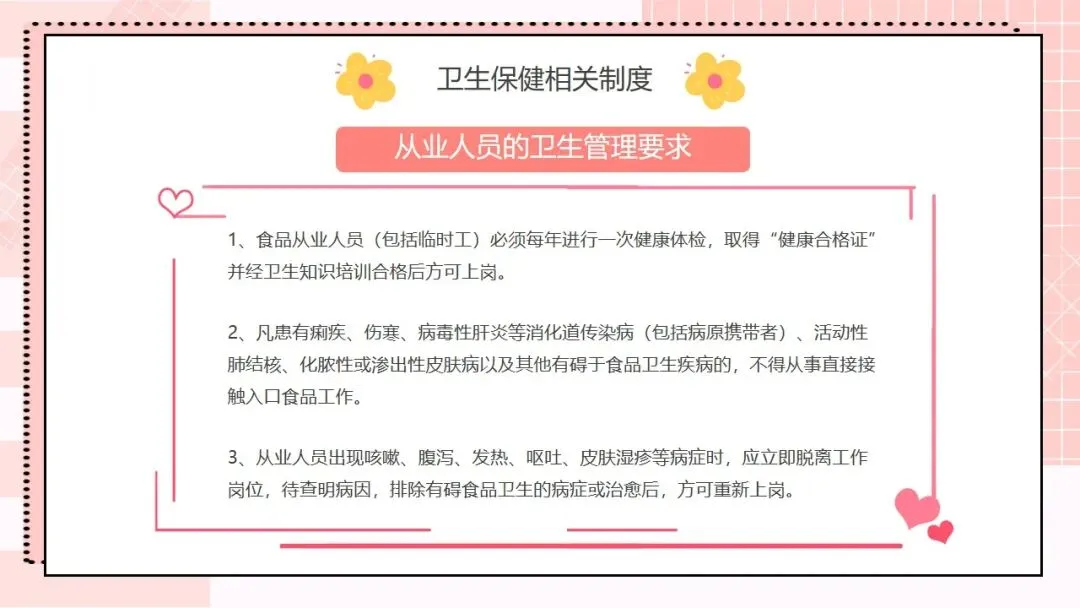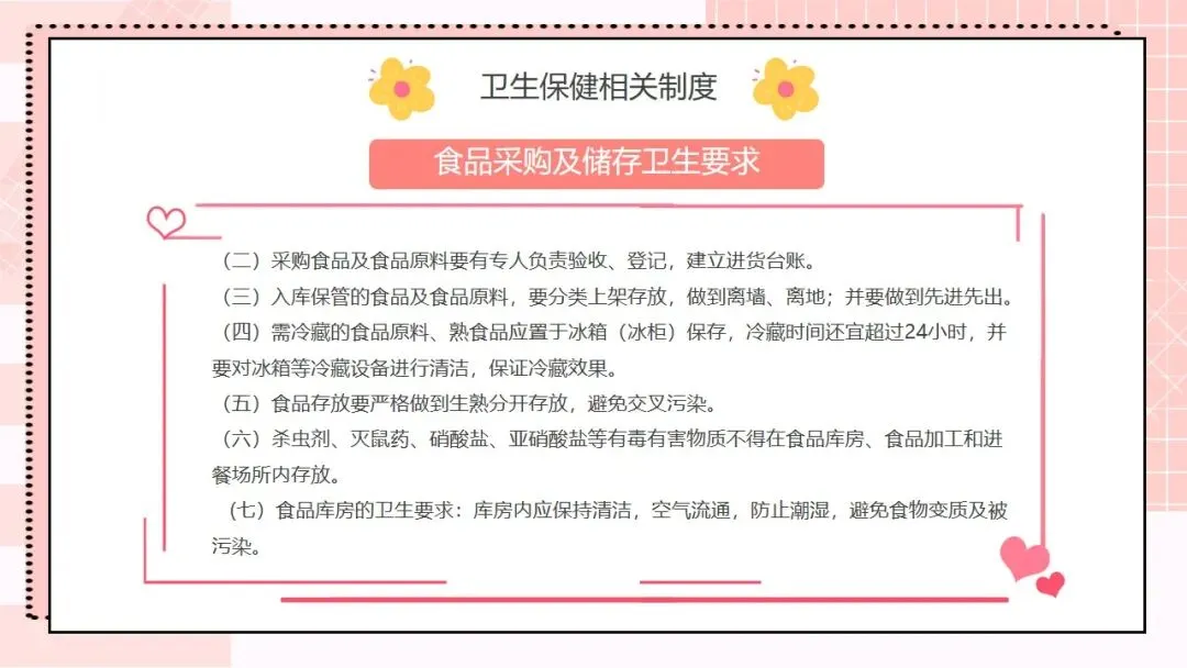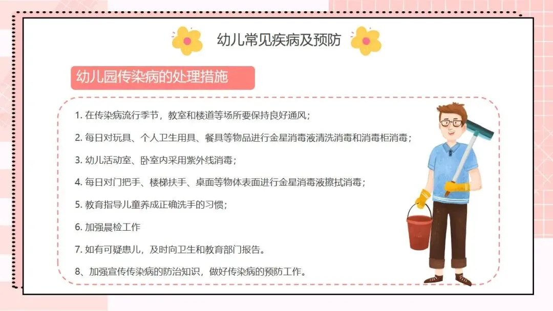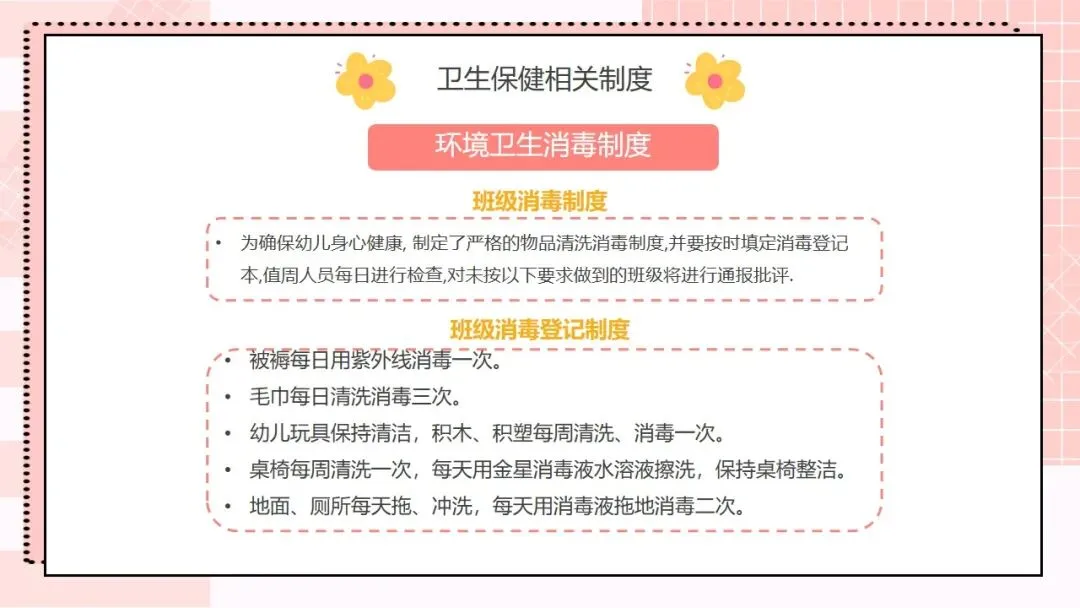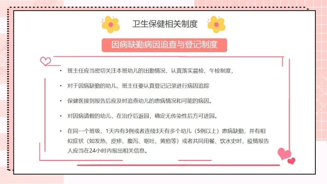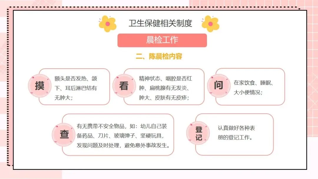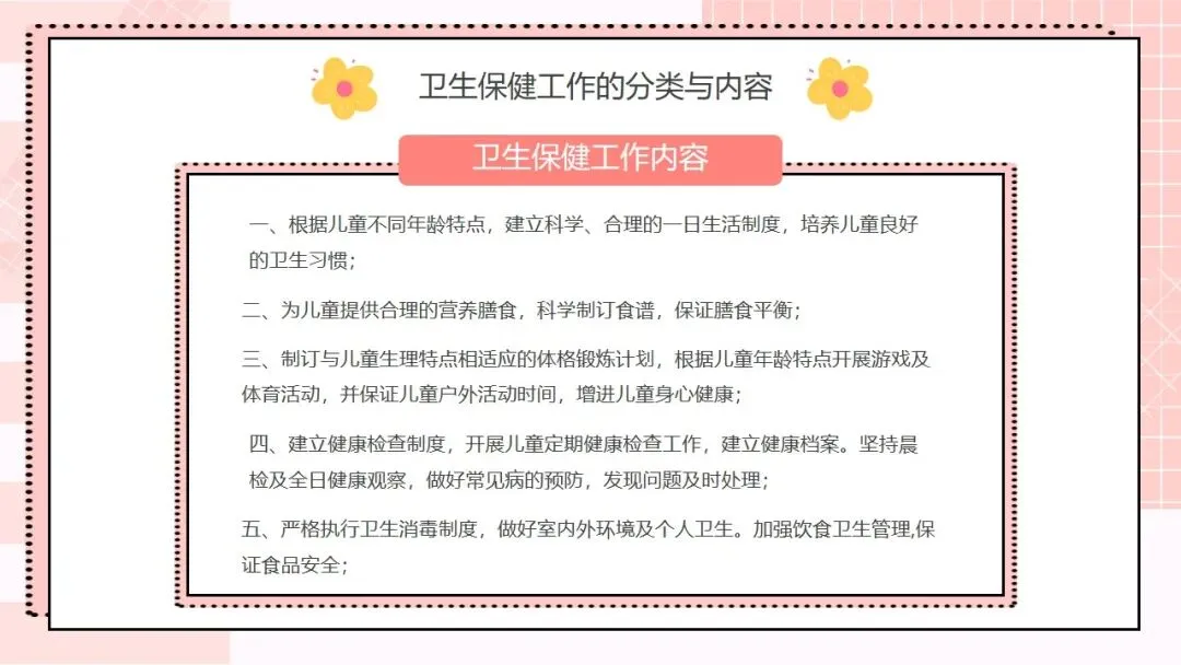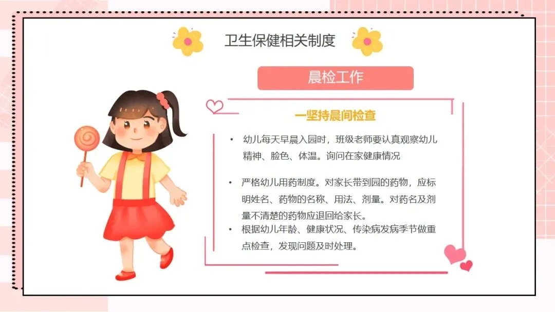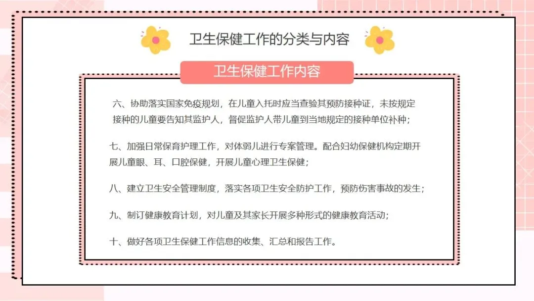 接下来是核心工作内容,这也是我们日常工作的重要指引,一共有十条。第一,根据幼儿不同年龄特点,建立科学、合理的一日生活制度,从小培养幼儿良好的卫生习惯;第二,为幼儿提供合理的营养膳食,科学制订食谱,保证膳食平衡,满足幼儿生长发育的营养需求;第三,制订与幼儿生理特点相适应的体格锻炼计划,结合年龄开展游戏和体育活动,保证充足的户外活动时间,增强幼儿体质;第四,建立健康检查制度,开展幼儿定期健康检查,为每位幼儿建立健康档案,坚持晨检和全日健康观察,做好常见病预防,发现问题及时处理;第五,严格执行卫生消毒制度,做好室内外环境和个人卫生,加强饮食卫生管理,守住食品安全底线;第六,协助落实国家免疫规划,幼儿入托时严格查验预防接种证,对未按规定接种的幼儿,及时告知并督促家长带其补种;第七,加强日常保育护理,对体弱儿建立专案管理,配合妇幼保健机构开展幼儿眼、耳、口腔保健,同时重视幼儿的心理卫生保健;第八,建立卫生安全管理制度,落实各项防护措施,预防幼儿伤害事故发生;第九,制订健康教育计划,通过多种形式为幼儿和家长开展健康教育活动;第十,做好各项卫生保健工作信息的收集、汇总和报告,做到工作有记录、可追溯。。。。