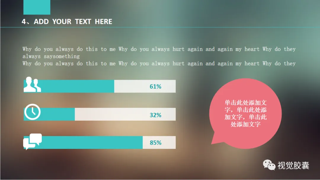 PPT展示中不需要过多的文字,往往只需要一个词语、数据、图标、图片等,内容应该做到尽可能的精炼,表现形式则可以多加变化。