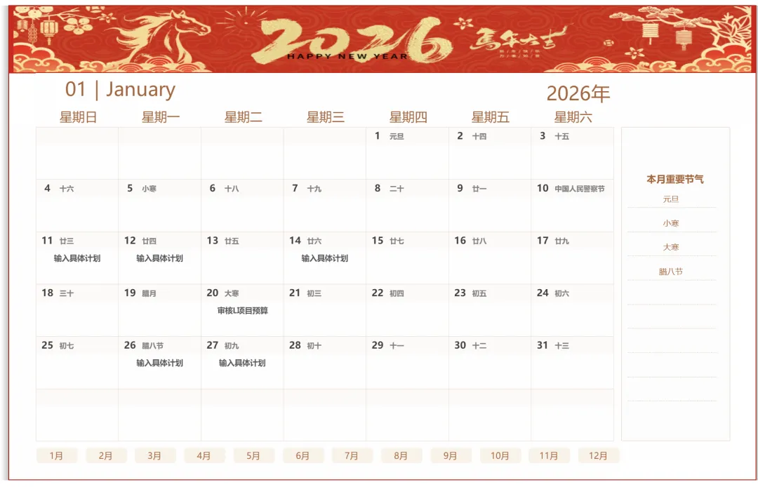 【10套】2026年马年日历工作计划表Excel模板可编辑下载