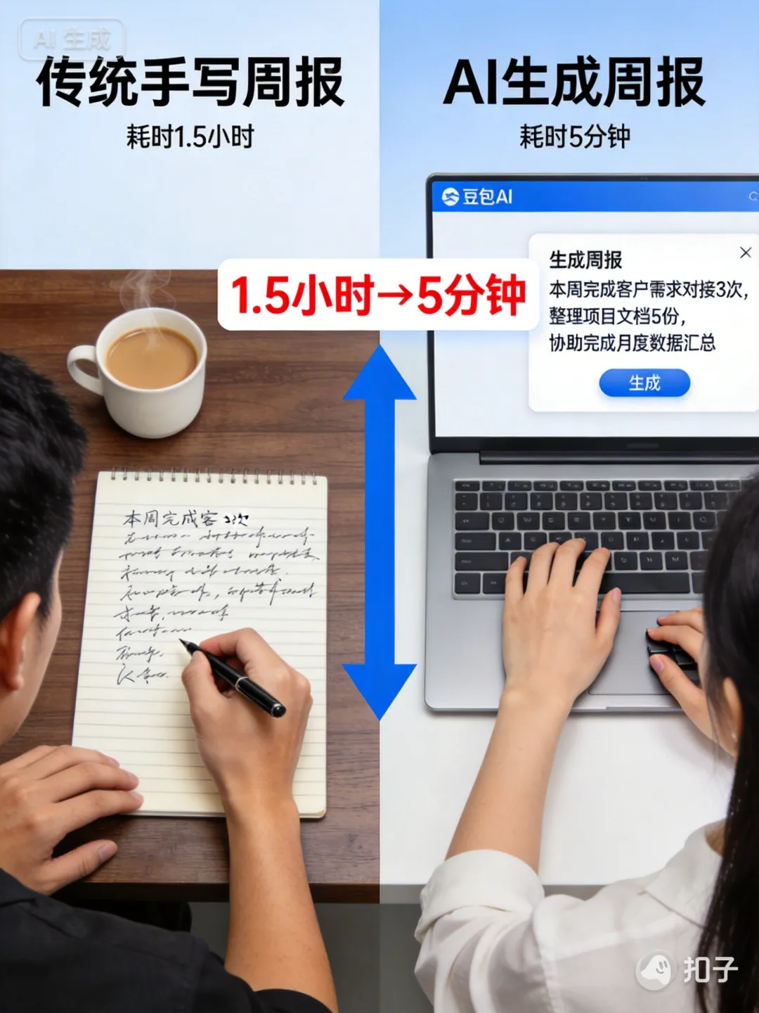 现在我用豆包写周报,3步搞定,5分钟完成。
