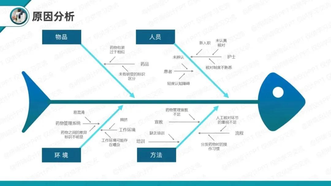 例如在给药错误的不良事件中,护士原因可能为新入职、未认真核对等,患者问题是比较小的,例如未检查,未发现药物异样,物品中可能是因为包装太过相似,没有明确的标识等。