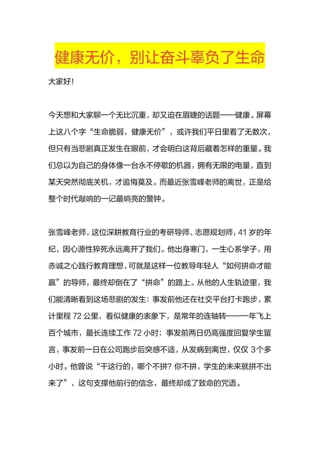 >【通用】【健康教育】主题班会PPT+逐字稿:从张雪峰事件反思——健康无价
