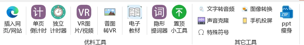 这是个专门用于WPS演示/Powerpoint中的插件,解决它们本身没有的功能,比如网页插入、插入VR图片和视频(不具备制作功能)、简单的课堂倒计时、普通图片转成VR图、支持2026新版电子教材、PPT瘦身(大幅压缩课件中的音视频和图片,而不改变它们的显示效果),同时集成了老师经常用到的一些功能,比如提词器、文字转音频、声音克隆、图像转换、在PPT中插入手机投屏、常用的各种链接……大大方便了老师们备课,这也是获得老师们推荐的主要原因。