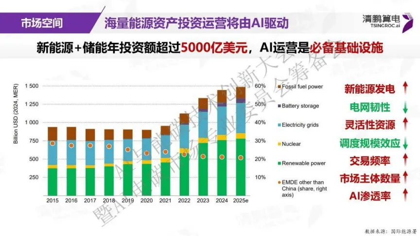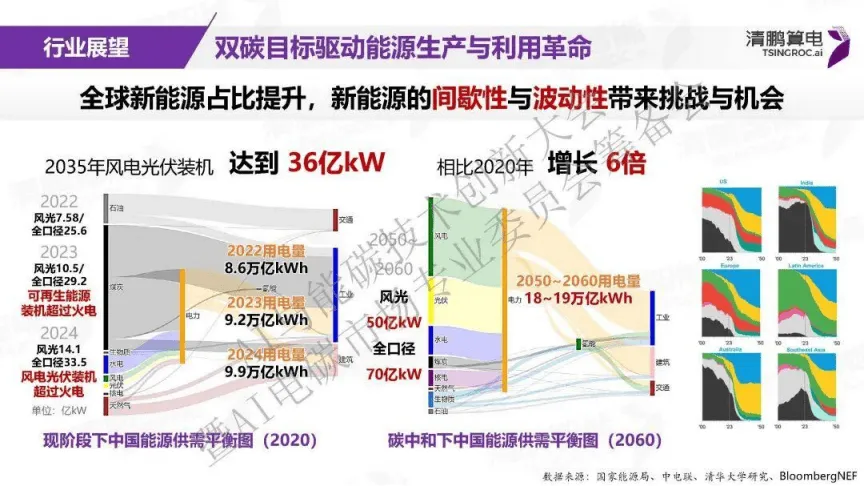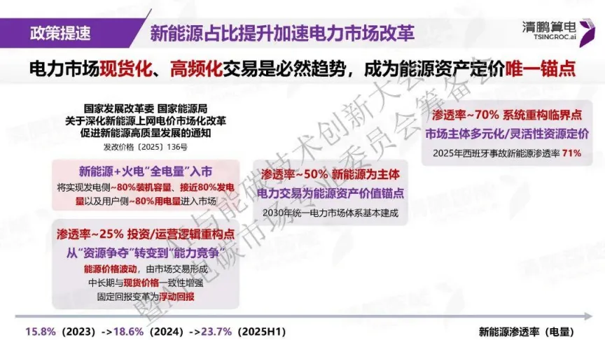 双碳目标推动全球能源生产与利用变革,中国新能源装机规模快速增长,2035年风电光伏装机预计达36亿kW,较2020年增长6倍,新能源的间歇性与波动性为电力行业带来挑战的同时,也推动了电力市场的深度改革。政策层面,新能源“全电量”入市等举措落地,让发电侧、用户侧超80%的装机、发电量及用电量进入市场,电力市场现货化、高频化成为必然趋势,新能源渗透率提升也重构了能源行业的投资与运营逻辑,从资源争夺转向能力竞争。