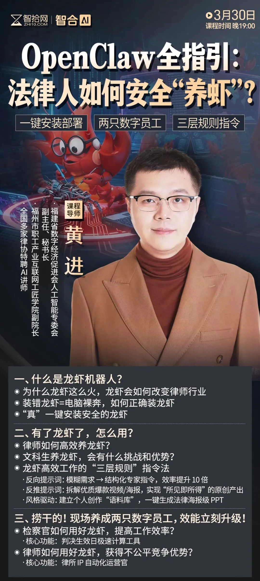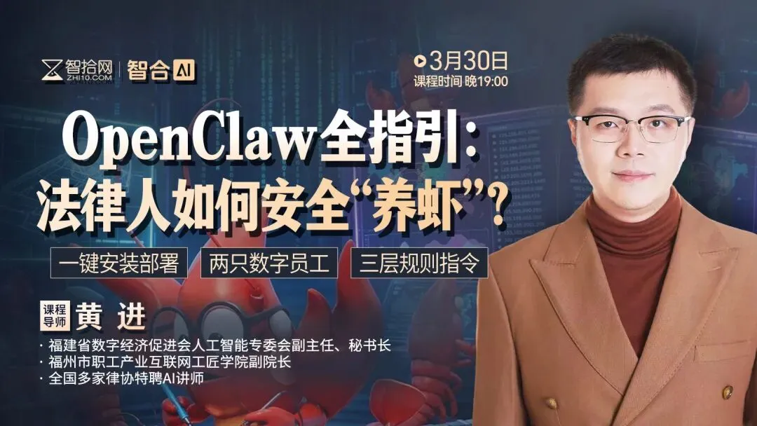 3月30日19:00,智拾网邀请到AI实战专家、全国多家律协特聘AI讲师黄进老师,带来这场专为法律人设计的OpenClaw直播。