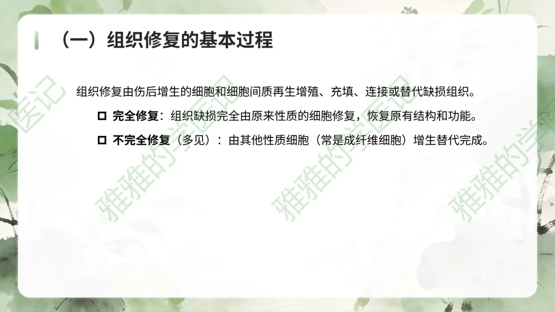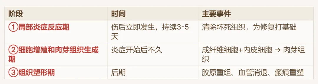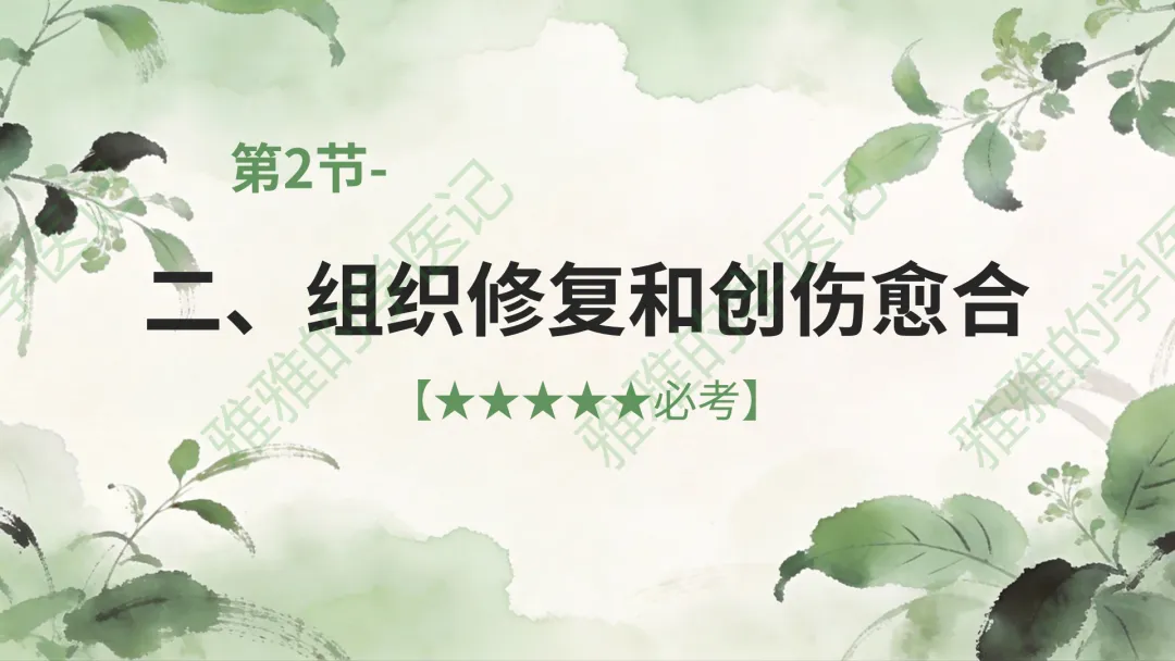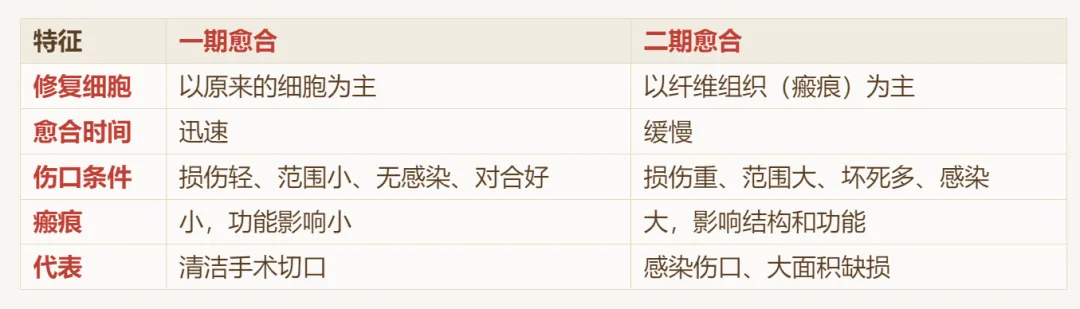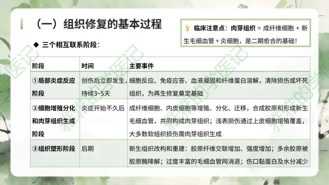 💡 临床注意点:肉芽组织 = 成纤维细胞 + 新生毛细血管 + 炎细胞,是二期愈合的基础!
