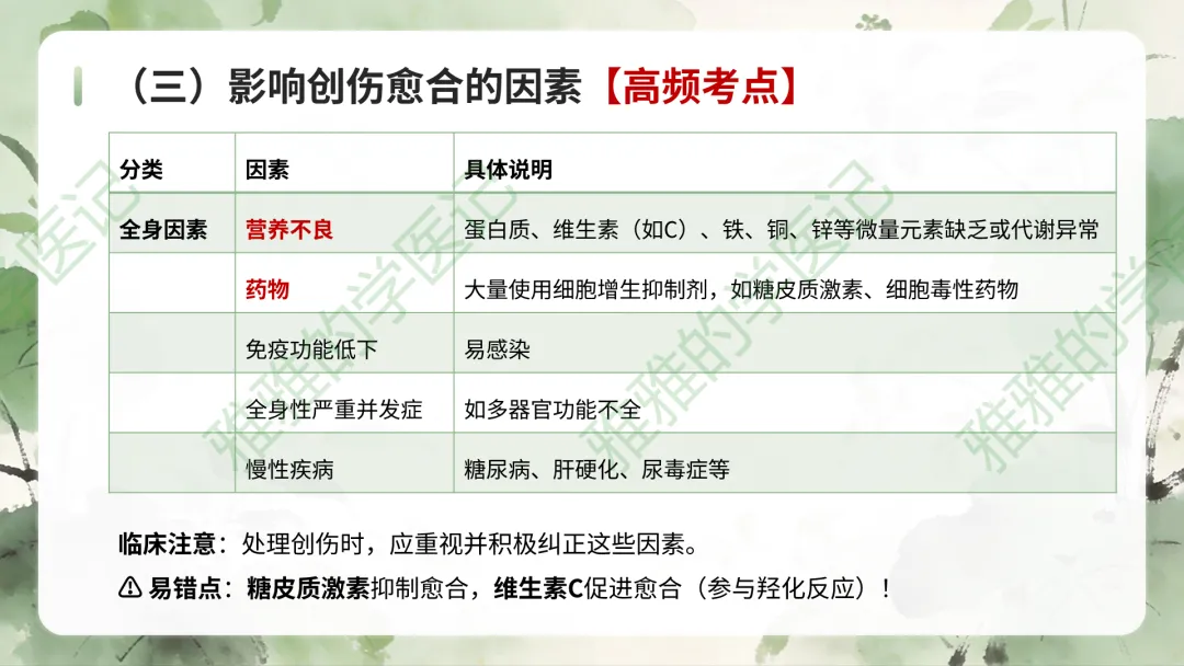 ⚠️ 易错点:糖皮质激素抑制愈合,维生素C促进愈合(参与羟化反应)!