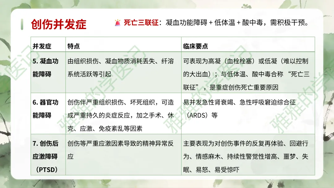 🚨 死亡三联征:凝血功能障碍 + 低体温 + 酸中毒 → 恶性循环,需积极干预!