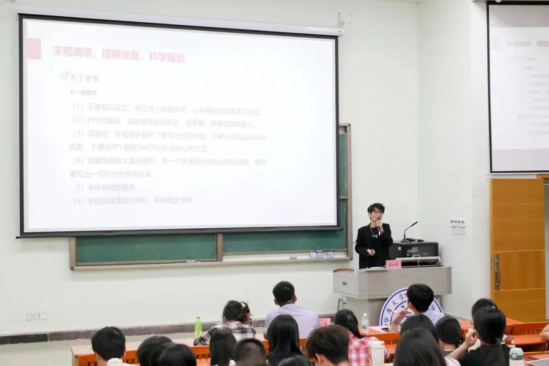 讲座伊始,蔡灿辉先生结合自身竞赛评审与项目孵化经验,围绕参赛方法、PPT逻辑梳理、赛前准备及创业赋能四个维度,系统讲解了备赛要点。他首先介绍了高教主赛道与“青年红色筑梦之旅”赛道的参赛标准、分组规则及评分侧重点,针对创意组、创业组与红旅组的不同评审要求,重点剖析了各赛道PPT的内容逻辑与亮点构建框架,并结合国家级竞赛典型案例,分享了实用技巧,引导学生立足评审视角,撰写逻辑清晰、重点突出的参赛材料。