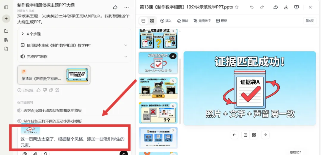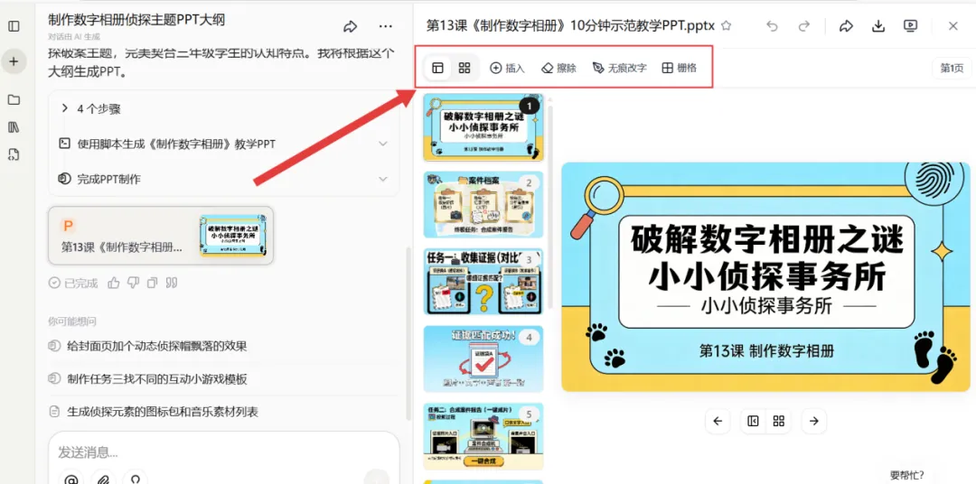 生成后的PPT直接在网页里展示,每一页都能实时编辑: