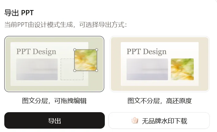 如果导出后还想添加动画、插入其他素材—选图文分层,可拖拽编辑。图片和文字是分开的,导出后在PPT里随便改——加动画、加图标、调位置,想怎么改就怎么改。