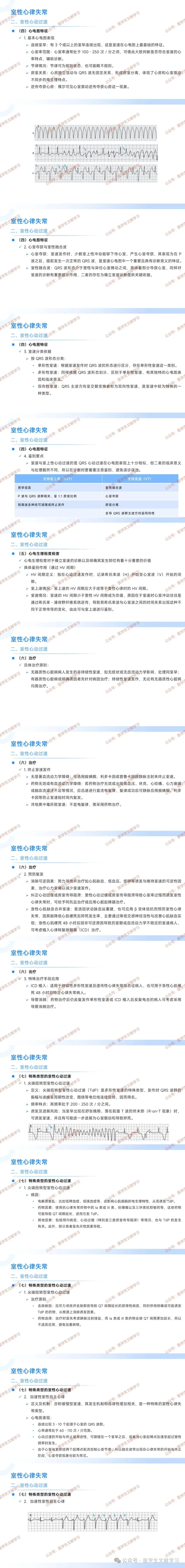 特殊类型:尖端扭转型室性心动过速发作时 QRS 波群特征明显,可由多种因素诱发,治疗需去除病因、用镁盐治疗;加速性室性自主心律与自律性增加有关,常发生于器质性心脏病患者,一般无需治疗;特发性室性心动过速发生于无结构性心脏病患者,可药物治疗或导管消融。
