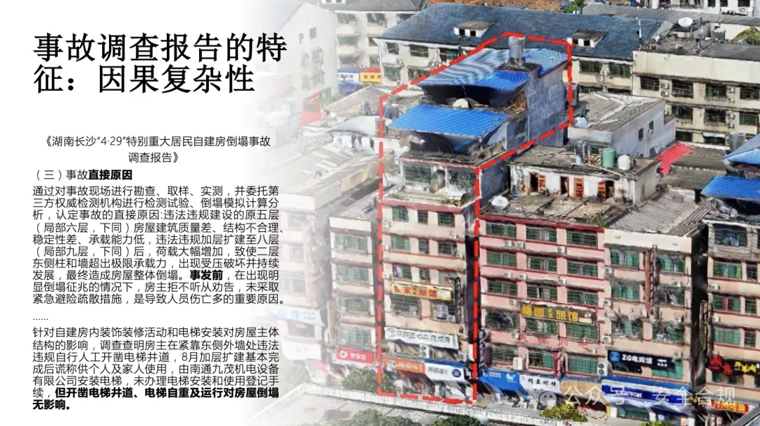 如在湖南长沙自建房倒塌事故中,需要结合现场勘察、取样、检测,甚至是倒塌模拟计算,来综合分析认定建筑工程安全质量事故的技术原因(结构、荷载等),通过调查询问认定人为原因(不听劝),对于一些虽然违规但缺乏因果关系的也要进行排除(加装电梯问题)。这其中既有直接原因,也有间接原因,既有专业判断,可能也有一些经验判断。正如,陈胜、吴广起义的直接原因是什么?会天大雨,道不通,度已失期。失期,法皆斩。也就是,他们马上要死了。至于秦末的若干问题,那是间接原因。