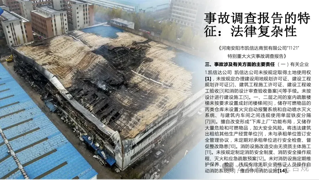如在凯信达商贸公司火灾事故中,调查组对公司所违反的土地管理法、城乡规划法、建筑法、消防法、建筑设计防火规范(GB50016-2014),以及《河南省房屋租赁管理办法》(河南省人民政府令第167号,2015年)安全生产法、河南省消防条例、《机关、团体、企业、事业单位消防安全管理规定》《生产安全事故应急条例》(国务院令第708 号,2019 年)等多个法律法规的若干规定进行列举并加注,涉及的法律规范纵向覆盖法律、行政法规、部门规章、地方性法规、地方政府规章、国家强制性标准等多个层级。有些事故调查甚至还会横向跨越行政法、民商法、刑法、社会法、经济法等多个法律部门…这些法律规范之间的衔接与适用边界需要专业法律判断。在调查组看来,土地管理和城乡规划违法行为和事故发生也有一定的关联…
