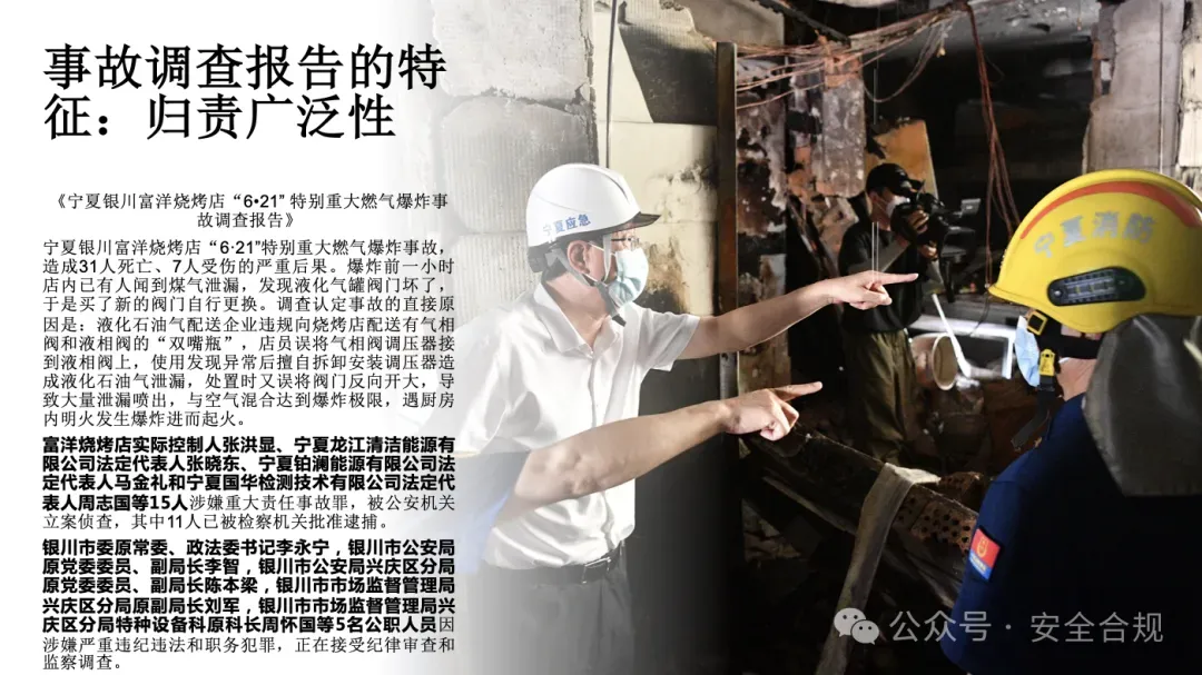如在富洋烧烤店燃气爆炸事故中,追责范围相当广泛。追责范围既包括管“气” 的部门(燃气,住建),也包括管“瓶”的部门(特种设备,市场监管),当然也少不了和火有关的消防(疏散楼梯少一个)。对企业主体的追责,则涉及了饭店、检验检测机构等多个主体。值得注意的是,目前对于公职人员的问责备受关注,这种责任也主要取决于因果关系,如消防部门对此次事故的责任。(报告尽管没介绍死因,但人并非炸死的二是熏死的。报告记载,当时的楼梯被炸毁、隔墙和冰箱也被炸毁并堵塞在楼梯位置,人出不去,只能被燃烧的有毒烟气活活呛死。也就是说,尽管有消防违规,但是,致命因素的爆炸燃烧和爆炸形成的堵塞二者皆因爆炸而起,就是有两部楼梯也不好使。因此消防的原因力较小,因此后面的监察调查就没有往消防这边靠。)