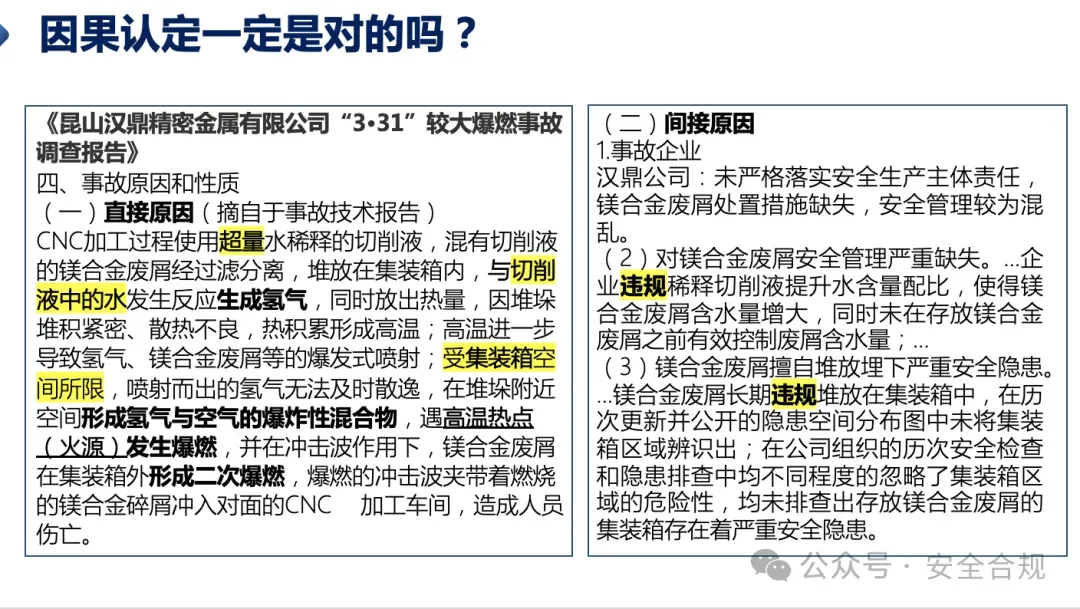 对应第一个特征,因果关系的认定是否一定科学?如昆山精密金属公司的爆燃事故,报告的归因以化学物理反应过程为主(这是无法归责的),除此以外的细节才决定归责。如“超量”和“集装箱”。二者在间接原因中被认定为“违规”,属于对人的不安全行为进行了认定。