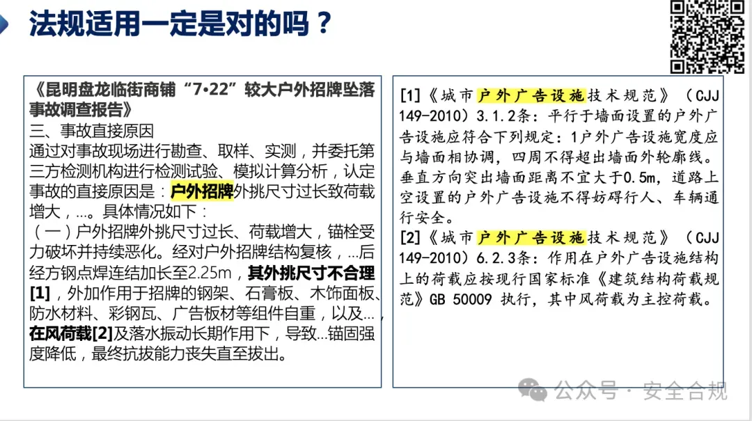 对应第二个特征,法规标准的适用是否就准确无误?云南的朋友应当熟悉这起事故,事故造成3死7伤(其中两姐妹一死一伤)。报告指出,直接原因是“户外招牌” 因外挑尺寸不合理,最终在风荷载长期作用下酿成悲剧。又因广告牌系房屋产权人、管理人负责安装维护,调查组遂认定刘泽民、徐健峰二人涉嫌犯罪。不过从昆明公安那边了解到,并没有起诉。