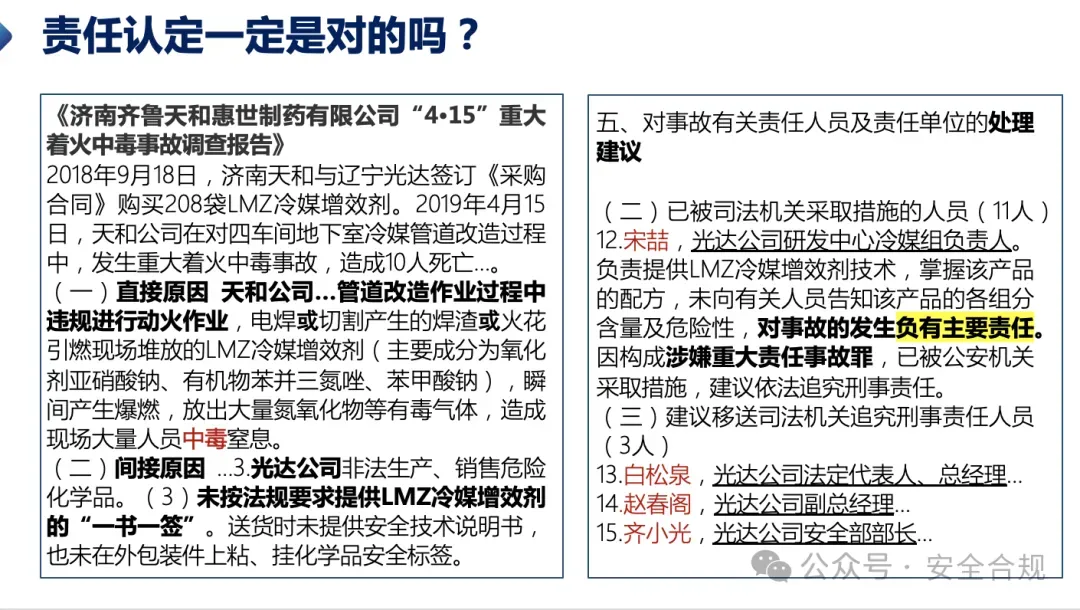 对应第三个特征,责任认定一定是合法合理?比如济南制药那个事故,报告认定冷媒供货商对事故“负有责任”,虽然其本属于行政评价,但对刑事追诉影响很大。事故直接原因提到毒气系现场堆放的冷媒增效剂燃烧释放的氮氧化物。但是,按照消防法规定,动火作业必须清理一切可燃物(无论有没有毒)。但调查组的思路却是,尽管如此,如果没有冷媒也就不会产生毒气。接下来,就是看有没有违反法规——“事故责任调查之所以调查原因,是要根据在某案件中能否发现法律(刑法、各种行业法、民法等)所规定的“剧本”(将事实带入禁止某行为的法规范)来判定法律责任,在此限度内探求“原因”。”——王贵松总结的太精辟了。巧了,光达公司确实违反了危化品条例(未按要求提供LMZ冷媒增效剂的“一书一签”)!那就不好意思了。
