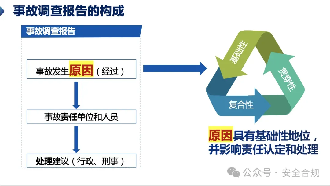 这三方面就是事故调查报告的主要结构,即事故发生原因、事故责任认定和事故处理(追究责任)。其中,事故原因是具有基础性地位的,原因的认定必然要包含因果关系判断,任何事实和责任认定也都建立在因果关系的基础之上。可以说,原因具有基础性、贯穿性、复合性的特征。