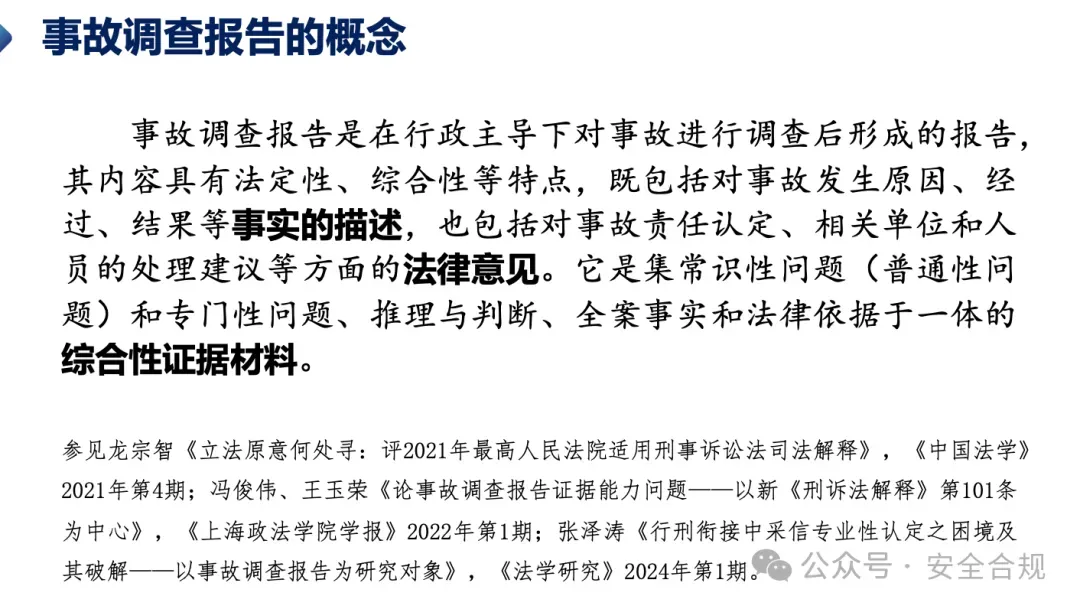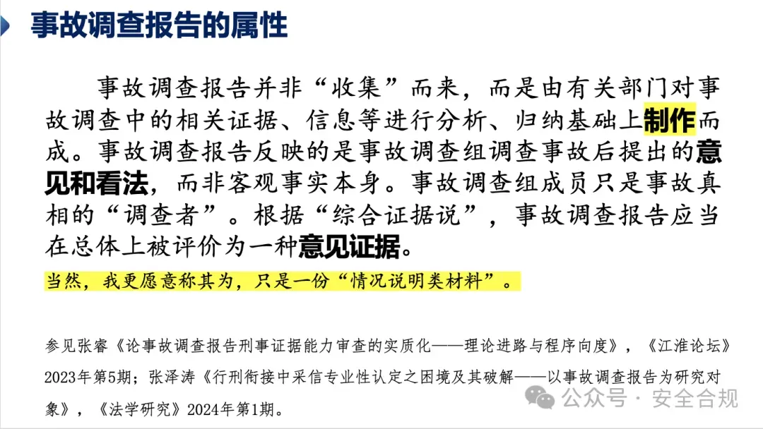 我们还是先看一个视频(13min),激发一下兴趣,舒缓一下氛围,铺垫一下接下来要讲的内容。各位是否能理解?该视频中介绍了三个关键信息,一是事故原因:济南天和药业违规动火(未清理周边可燃物),且供货商未告知冷媒的“特殊危险性”致起火后中毒;二是责任认定:供货商光达化工对事故负有责任;三是处理建议:调查组认为涉嫌重大责任事故罪,建议司法机关追究刑事责任。应当说,该案涉及了此次要阐释的三个方面,非常全面,是一个极佳的研究样本。我们至少会留意到其中一个问题,即视频里提到的《最高人民法院最高人民检察院关于办理危害生产安全刑事案件的司法解释》(法释〔2015〕22号)第一条,该罪的犯罪主体“包括对生产、作业负有组织、指挥或者管理职责的负责人、管理人员、实际控制人、投资人等人员,以及直接从事生产、作业的人员”。问题是,涉案人员是否属于此类人员呢?另外,据了解到的情况,本案在原因认定、调查取证等方面还存在诸多问题。下面就带着对本案的思索,来了解一下事故调查报告这种“新证据类型”的具体内容、法律属性、特征、定位等重要内容。事故调查报告作为一份“文件”来说,显然是不能直接拿来当定罪依据的。这个道理很多人都知道。但在座是否知道,其实报告中的很多内容,甚至也不能直接拿来当作证据使用。原因是,报告里涉及了太多内容,有必要一一拆解、识别和归类,才能准确审视一份事故调查报告。可以先从报告的显著特征上切入。