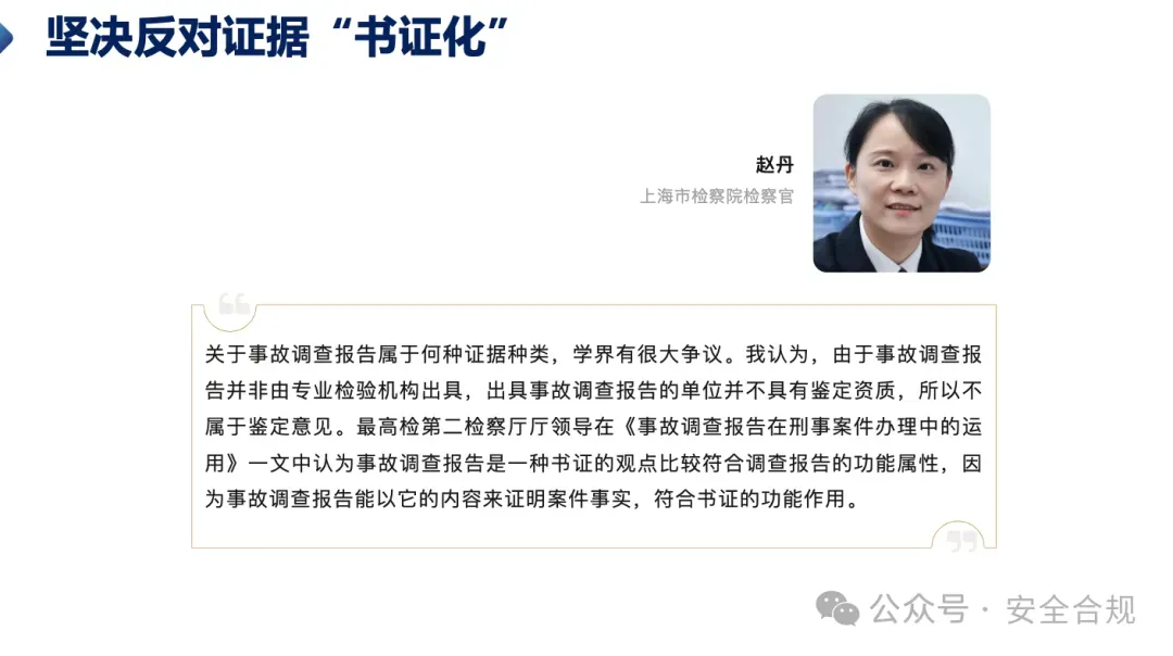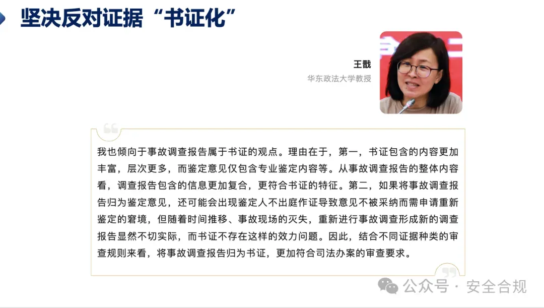 目前有一种倾向,试图用书证来总体界定事故调查报告。比如上海市检赵丹检察官,她在座谈中迎合了最高检领导的观点。但需要说明的是,首先,书证应当与书面报告、书面陈述相区分,凡是为行政程序、刑事起诉或审判准备的各种报告、陈述,均不应纳入书证的范畴;其次,二者于形成时间上存在本质差异,即书证具有事先性,其是在诉讼活动开始之前或在与诉讼活动没有联系的情况下形成;再次,事故调查报告是针对特定问题所形成的一种书面报告,而书证通常形成于刑事案件发生过程之中,基本上不会涉及案件中的专门性问题;最后,书证应当属于客观性证据而不是主观性证据,如前所述,报告之核心是主观性的意见证据。