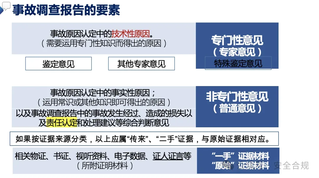 第二种是只需要运用常识或其他知识即可得出的意见,事故原因中的事实性原因。如堵塞消防通道造成无法逃生的认定,再如未履行安全管理职责等常见的间接原因。此外,还有事故调查报告中的事故发生经过、造成的损失以及责任认定和处理建议等综合判断意见。这些属于非专门性证据,或者普通意见(接下来我们用普通意见这个表述)。