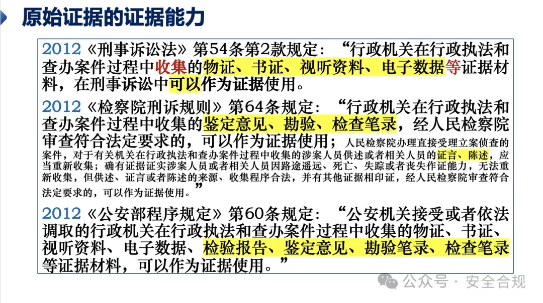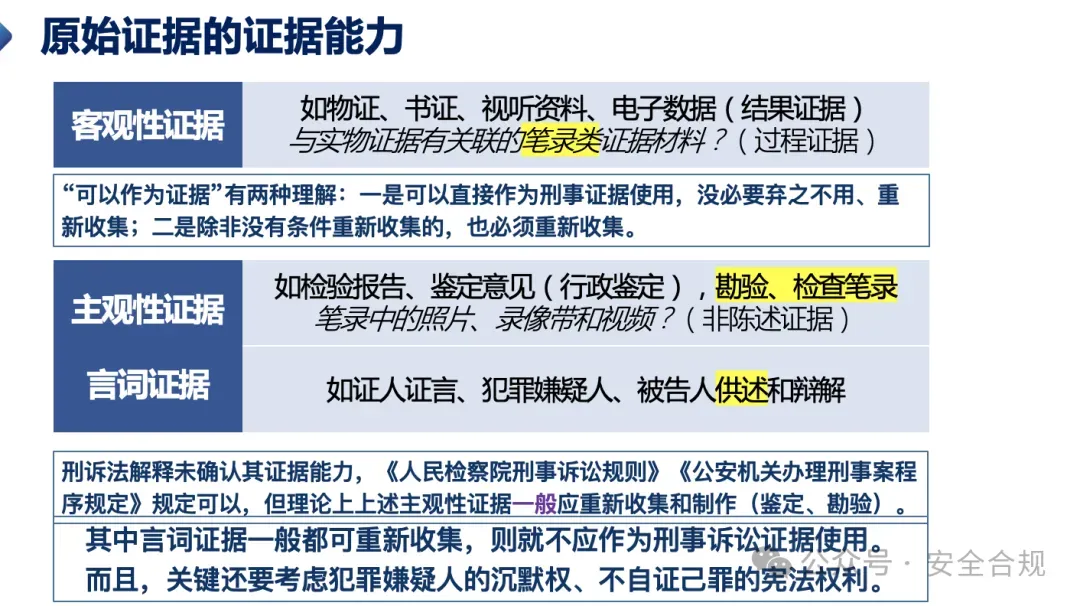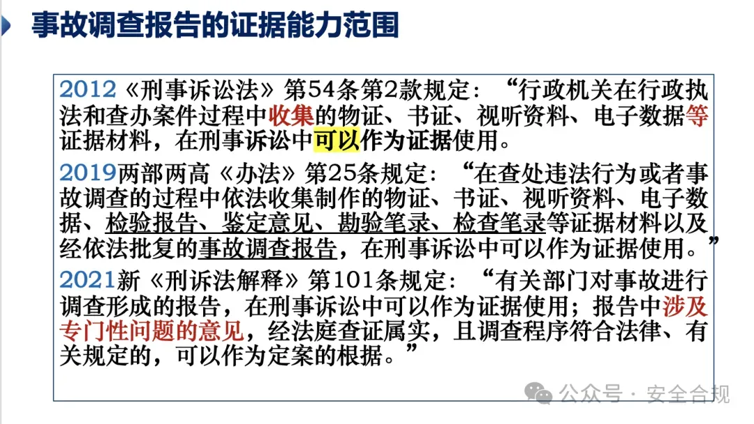 总结:尽管安全生产事故发生后,相关部门作出的事故调查报告要与收集调取的物证、书证、视听资料、电子数据等相关证据材料一并移送给司法机关后,但必须区分不同类型证据材料的证据能力,而不能照单全收并作为刑事证据。