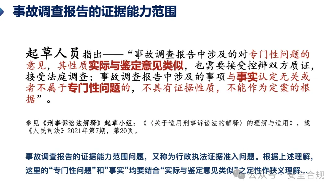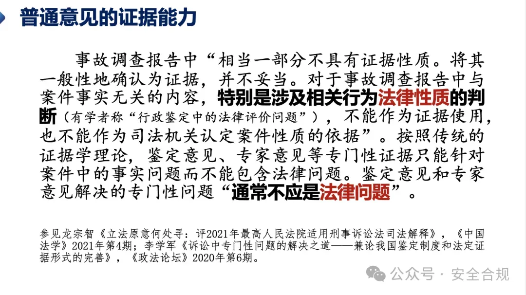 事故调查报告既要对事故原因进行专业性认定,同时也需要对案件事实进行“专业”的判断。但是,事实和责任认定虽然和事实有关,但却必然涉及相关行为法律性质的判断(对行为人的追责包括行政处罚、党纪政纪处分和刑事责任, 而行为人承担上述责任的前提条件均是违反了安全生产领域的行政法规。)将该等部分的报告内容一般性地确认为证据,龙宗智教授认为并不妥当。正如起草人员所说的,与事实无关的那部分不具有证据性质,特别是涉及相关行为法律性质的判断。具体来说,这是因为:按照传统的证据学理论, 鉴定意见、专家意见等专门性证据只能针对案件中的事实问题而不能包含法律问题。李学军教授也认为,鉴定意见和专家意见解决的专门性问题“通常不应是法律问题”。比如,对于行政犯具体违反前置性行政法规的证明,尽管有难度,能称之为专家意见吗?