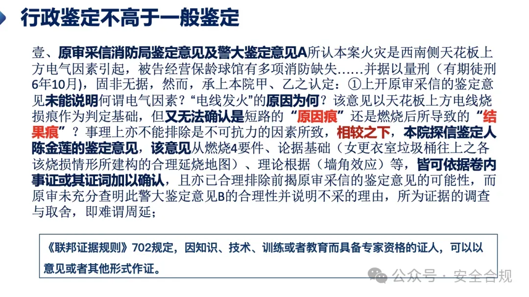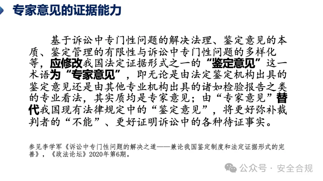 细究起来,安全生产领域的很多问题,比如前面说的户外招牌和户外广告设施的技术标准规范援引错误,或者是最常见的违反的前置性行政法规(典型的如:未尽安全生产管理、培训、教育等义务…)而作出的责任认定,我觉得是没什么专业性可言的。尽管个别的专业判断涉及超出了公安司法人员认知范围的行政法规、行业规章和行业标准,但在立法上未明确将其归属为一种特殊的专门性证据之前,是不宜视为专家意见。