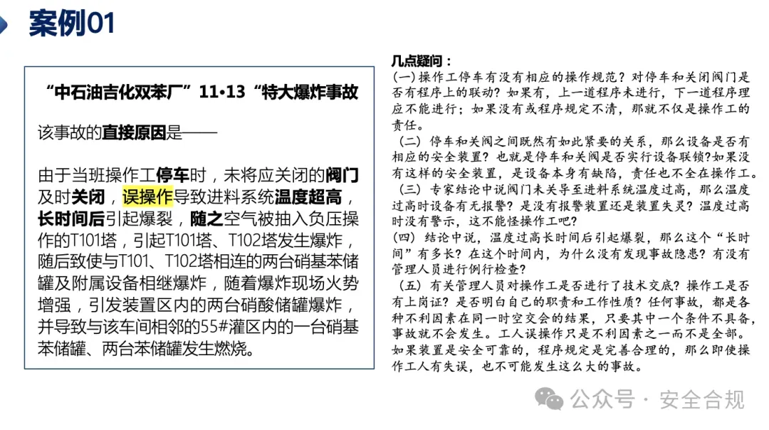 2005年,吉化发生一起特大爆炸事故。该事故的调查报告目前找不到。当年遭到了很多人(包括一些法学家)的批评(主要关于调查组中立性)。现仅就事故直接原因探讨一下:据相关的信息记载,该事故的直接原因是——由于当班操作工停车时,未将应关闭的阀门及时关闭,误操作导致进料系统温度超高,长时间后引起爆裂,随之空气被抽入负压操作的T101塔,引起T101塔、T102塔发生爆炸,随后致使与T101、T102塔相连的两台硝基苯储罐及附属设备相继爆炸,随着爆炸现场火势增强,引发装置区内的两台硝酸储罐爆炸,并导致与该车间相邻的55#灌区内的一台硝基苯储罐、两台苯储罐发生燃烧。可见,原因中仅一处涉及对人的行为的评价,即应关而未关阀门,系误操作。其余都属于物理化学反应方面的归因。