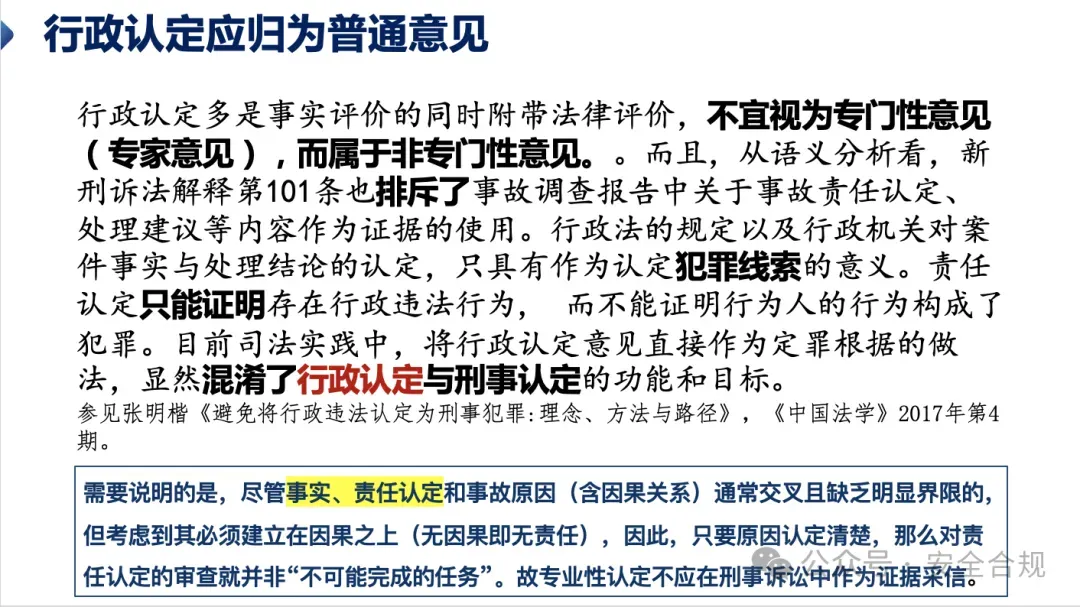 应当说,只要是涉及法律适用的、对特殊法律事实的认定(无论是否基于事实和专门性意见)均属于行政认定(法律适用意见),但并非狭义上的专门性(技术性、自然科学)证据。无论多专业,法律法规也不应作为一种专门性知识予以对待。新刑诉法解释第101条从语义分析上,也排斥了事故调查报告中关于事故责任认定、处理建议等内容作为证据的使用。这也是检察机关办理的安全生产事故案件中,有相当比例案件的最终追责人员与调查报告不一致的原因。