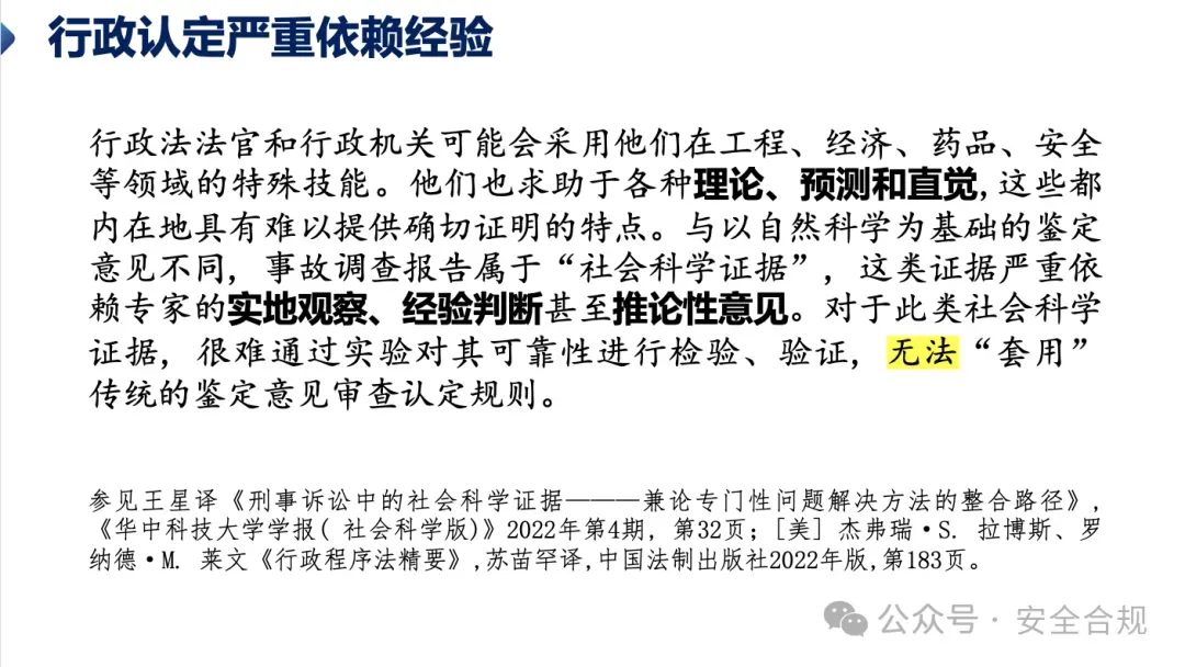 事故涉及的行政认定很复杂,根本无法套用科学证据的审查。但刚才所介绍的事故调查报告中的涉及专门性问题的意见(即行政鉴定),则是有条件套用鉴定意见(科学证据)的审查规则的。只是不想套用而已。