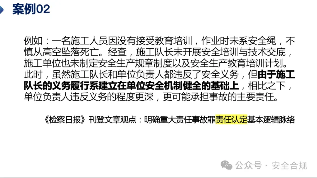 比如这个案例,一名施工人员因未接受过高空作业的任何教育培训,临时上岗发生了高坠事故,则,施工队长和单位负责人,谁应当承担责任以及主要责任呢?《检察日报》的一篇文章认为,考虑到施工队长的义务履行系建立在单位安全机制健全的基础上,因此,更主要的责任在于单位负责人。