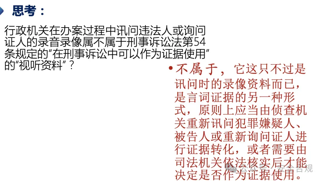 我们不妨思考两个问题:1.行政机关在办案过程中讯问违法人或询问证人的录音录像属不属于刑事诉讼法第54条规定的“在刑事诉讼中可以作为证据使用”的“视听资料”?实际上,不属于视听资料。因为它这只不过是讯问时的录像资料而已,是言词证据的另一种形式,原则上应当由侦查机关重新讯问犯罪嫌疑人、被告人或重新询问证人进行证据转化,或者需要由司法机关依法核实后才能决定是否作为证据使用。
