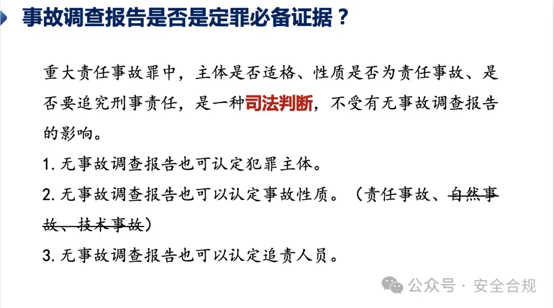 但是,有些司法机关却将事故调查报告作为定罪的必备证据,认为缺乏事故调查报告就无法判断是责任事故还是自然事故或技术事故,因此无法认定犯罪。