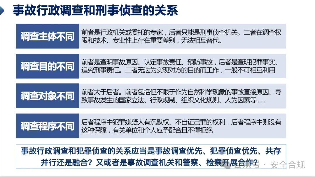 4.调查程序不同。后者程序中犯罪嫌疑人有沉默权、不自证己罪的权利,后者程序中则没有这种保障,有关单位和个人应予配合且不得拒绝。(《条例》第二十六条事故调查组有权向有关单位和个人了解与事故有关的情况,并要求其提供相关文件、资料,有关单位和个人不得拒绝。)