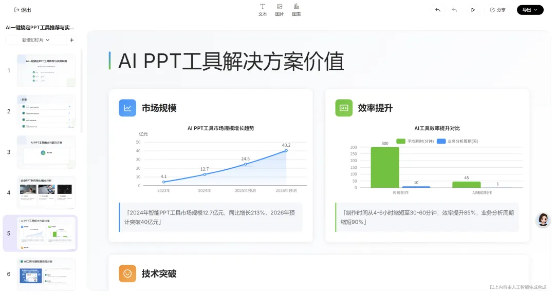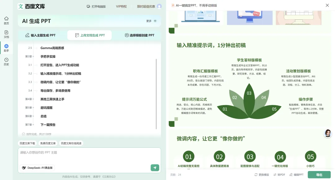 💡 小亮点:生成后可直接修改文字、替换图片,支持导出为PPT格式;搭配精准提示词,还能让内容更贴合你的实际需求。