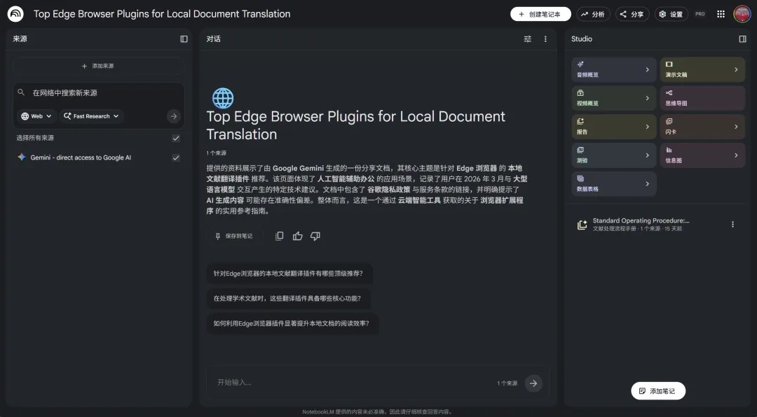 工作站的思维依旧称绝。打开就是三部分,左边可以放置本地文件、网络链接、以及AI自动搜集网络信息等,中间可以根据来源进行AI对话,右边可以根据来源和要求生成对应的PPT,报告,数据表,思维导图等。