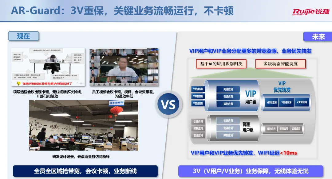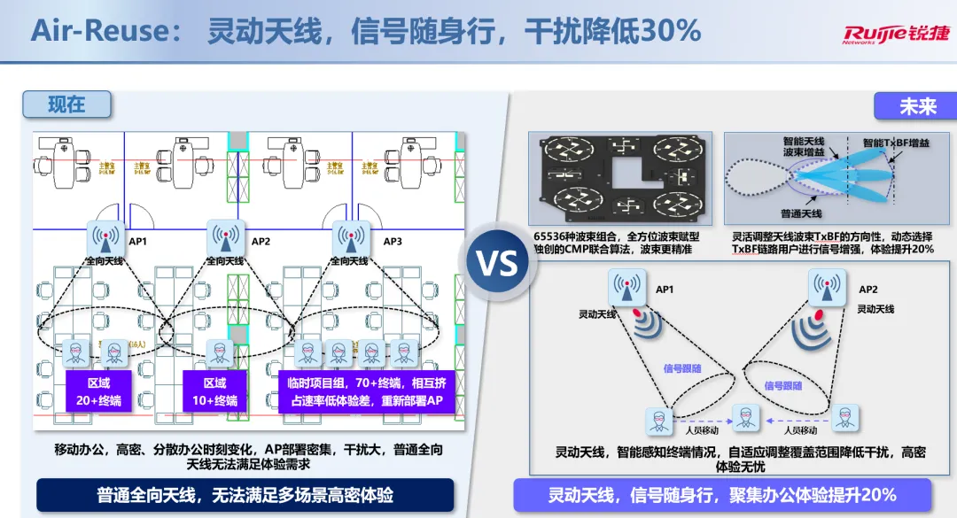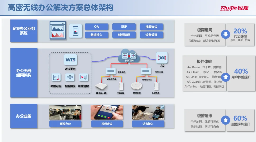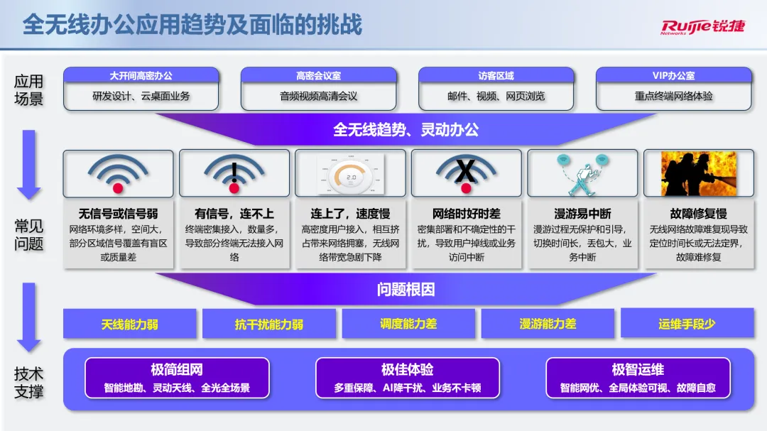 随着企业数字化转型加速,高密度办公场景下的无线网络已成为业务运转的核心基础设施。传统Wi-Fi方案在面对会议室密集接入、开放式工位海量终端、以及BYOD(自带设备)政策带来的设备激增时,往往暴露出三大瓶颈:信号覆盖盲区导致视频会议卡顿掉线,并发处理能力不足引发网络瘫痪,安全防护薄弱造成企业数据泄露风险。尤其在金融、科技、咨询等行业,一场关键会议的网络故障可能直接造成百万级损失,而访客网络与内部系统的混用更让IT部门疲于应对安全审计。本方案直击高密度场景下的"连接质量、承载容量、安全合规"三大核心诉求,为企业构建真正面向未来的智能无线网络底座。