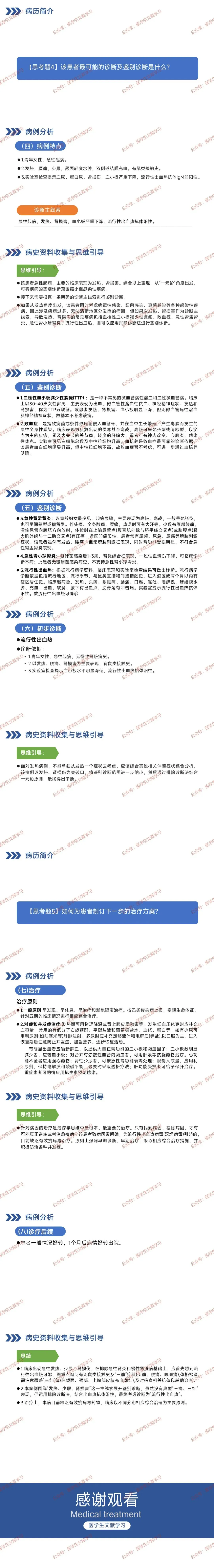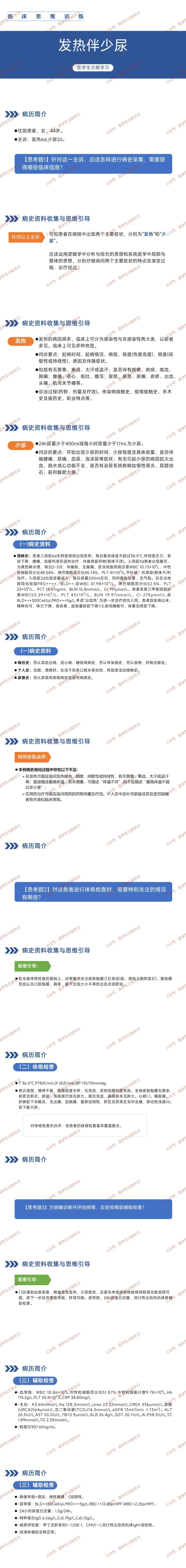 - 病史采集:需追问发热热型、伴随症状(如 “三痛”:头痛、腰痛、眼眶痛),少尿诱因,传染病接触史、鼠类 / 疫区接触史,既往肾脏病史。