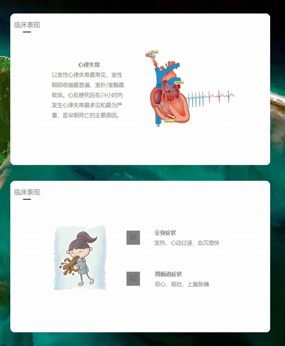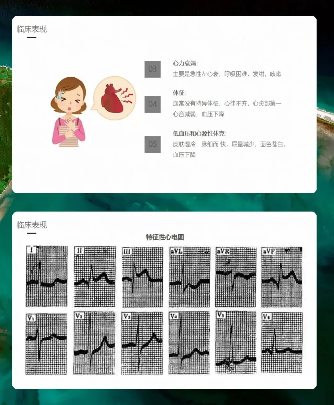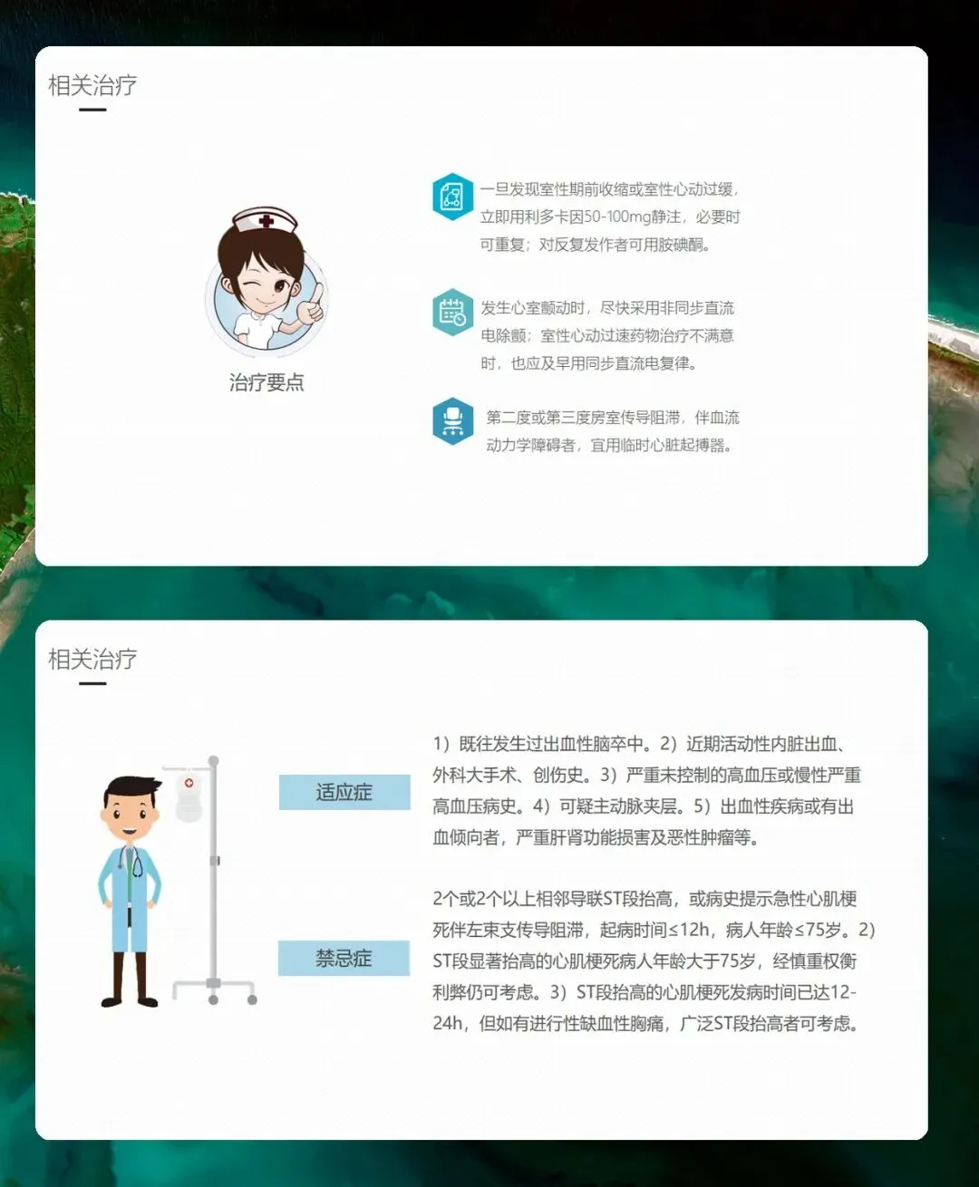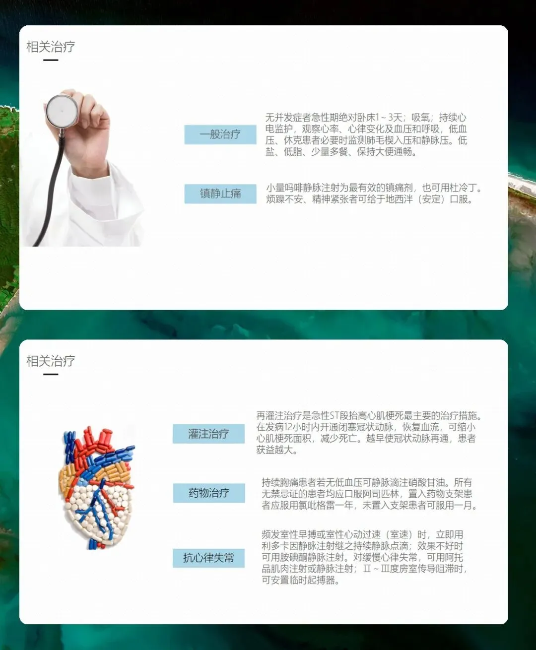 治疗配合是护理核心职责。再灌注治疗是ST段抬高心梗最主要措施,12小时内开通闭塞冠状动脉可缩小心梗面积、减少死亡,越早再通获益越大。我们要协助医生做好溶栓或介入术前准备,争分夺秒。药物治疗方面,持续胸痛者静脉滴注硝酸甘油,所有无禁忌患者口服阿司匹林,支架术后服用氯吡格雷一年。抗心律失常时,频发室早或室速立即用利多卡因,效果不好改用胺碘酮;发生室颤尽快非同步电除颤。镇静止痛首选吗啡静脉注射,烦躁不安者给予安定。