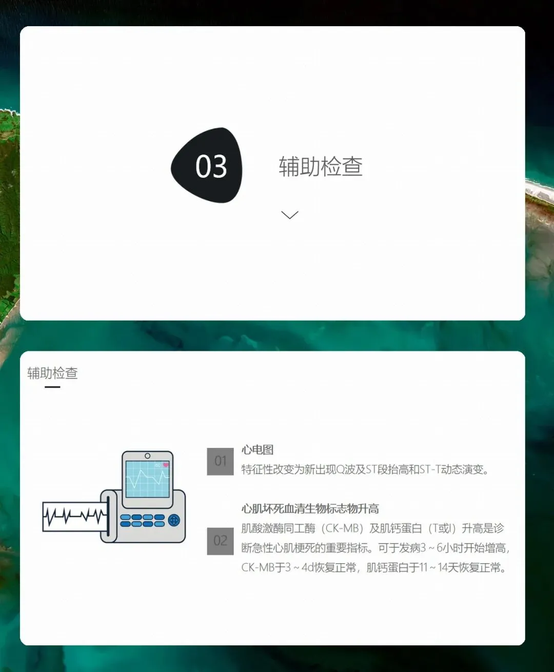 辅助检查中,心电图特征性改变为新出现Q波、ST段抬高和ST-T动态演变;心肌坏死标志物肌钙蛋白和CK-MB升高是诊断金标准,肌钙蛋白3-6小时开始升高,11-14天恢复正常。护理人员必须熟练掌握这些指标的变化规律,才能准确判断病情阶段。