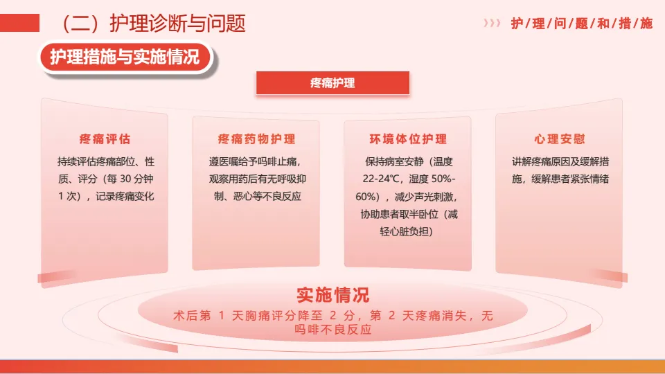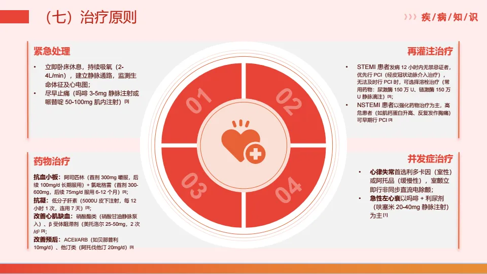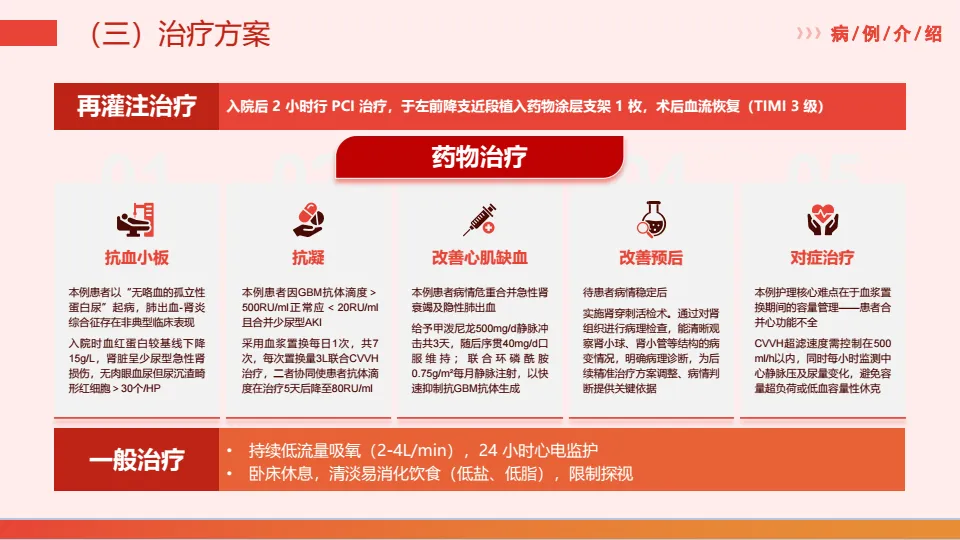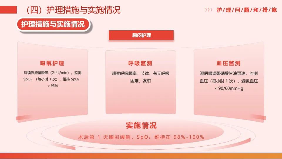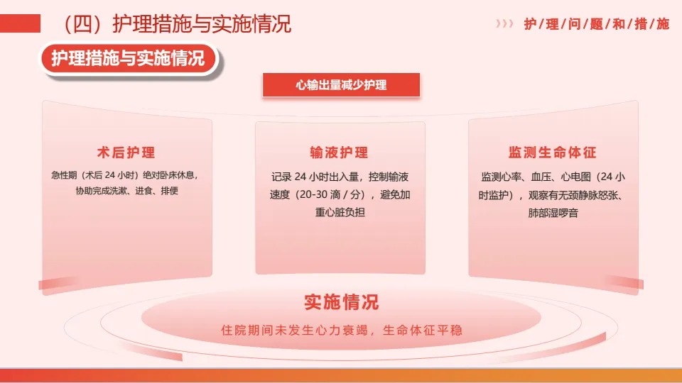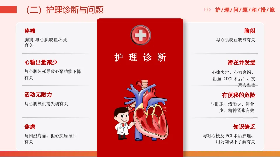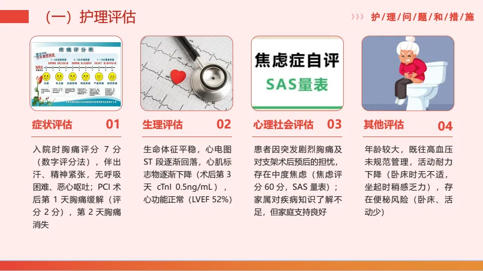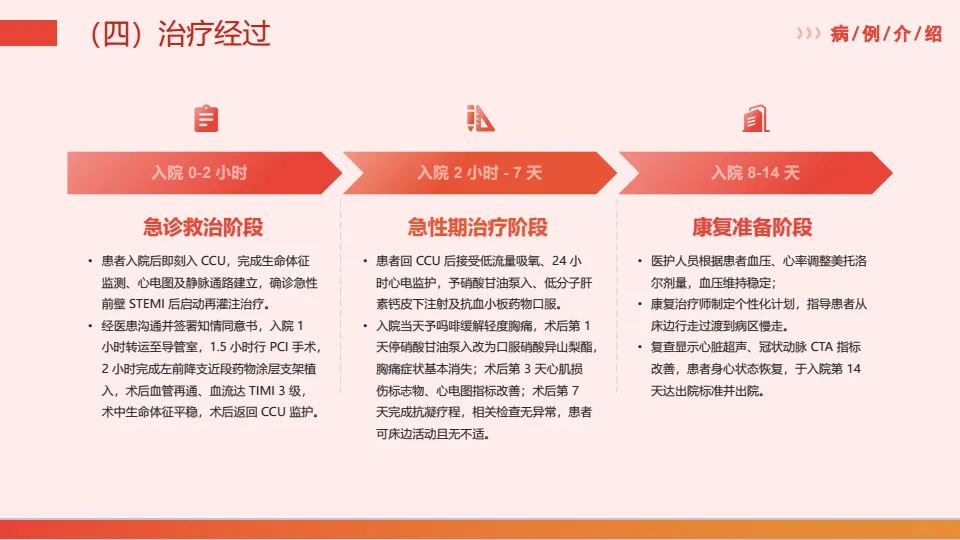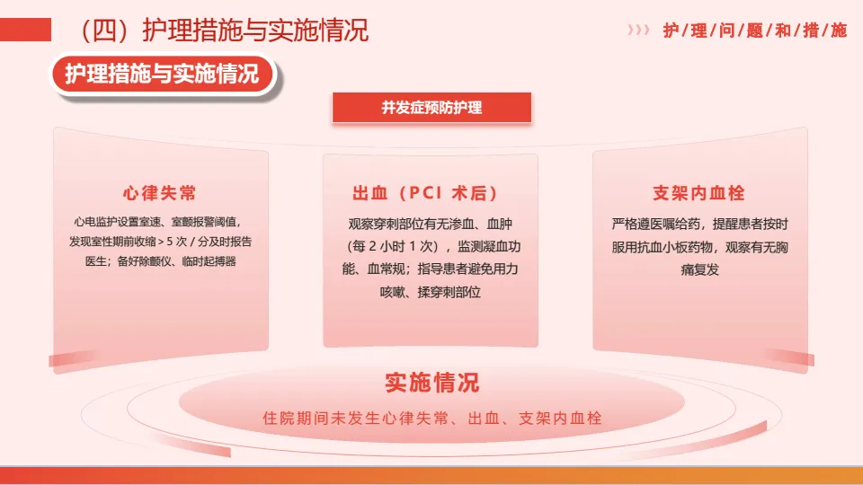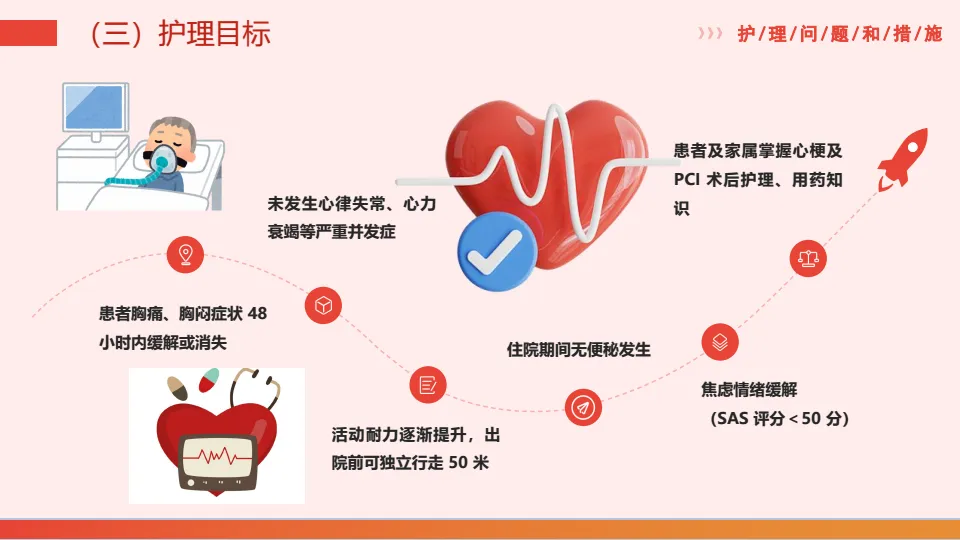 - 循证干预: 针对该病例,课件详细分析了从急诊PCI(经皮冠状动脉介入治疗)术后的监护,到并发症的预防(如心律失常、心源性休克),再到心理护理和康复指导的全过程。