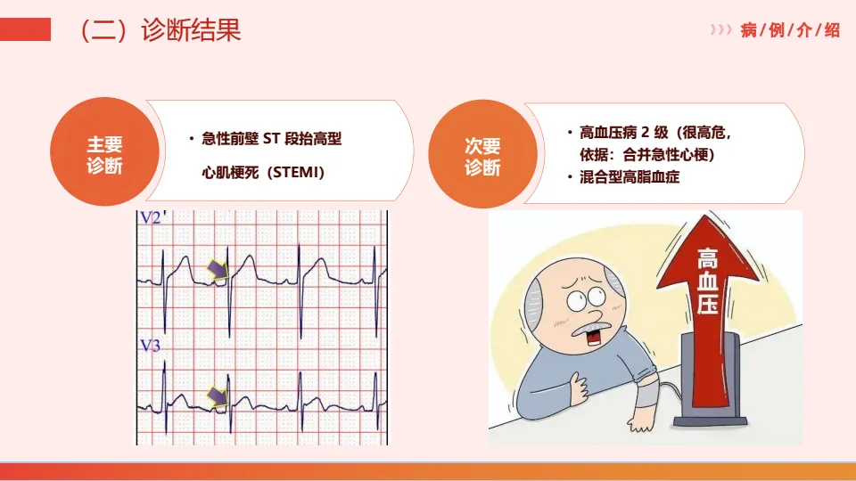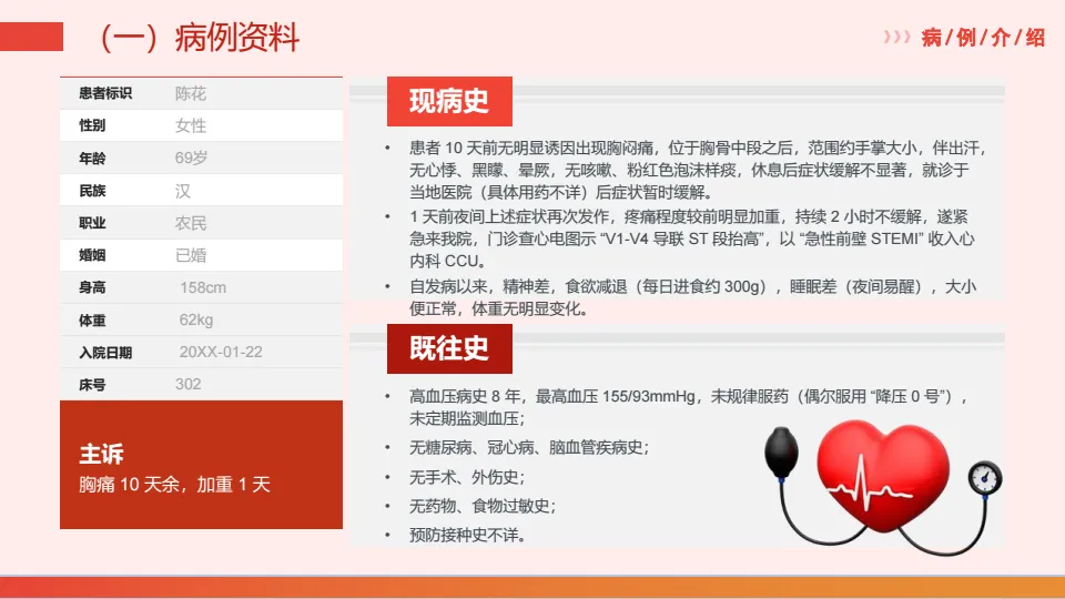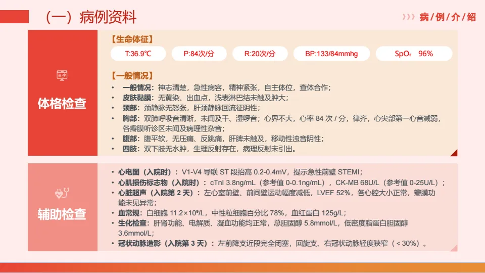 2. 病例真实,循证结合理论必须结合实践。这份查房报告选取了一位**急性前壁STEMI(ST段抬高型心肌梗死)**的真实病例。