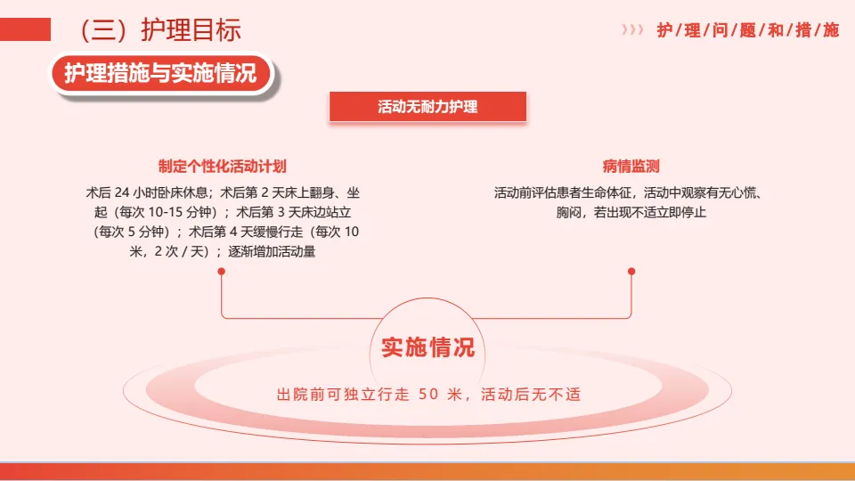 - 康复护理: 制定了从卧床到独立行走的阶梯式活动计划,确保患者安全。