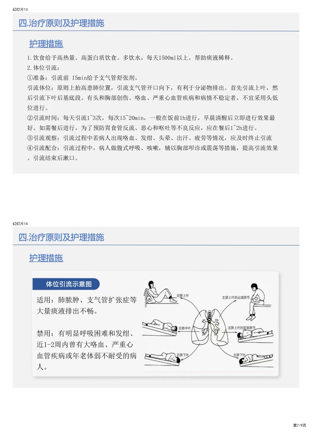 PPT里用真人示意图展示了不同肺叶病变的引流体位。