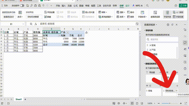 想要快速统计数据,除了用求和、计数、求平均值等公式,Excel有个强大功能:数据透视。它不修改源数据,而是通过灵活拖拽字段,将数据按不同维度重新排列组合,自动完成分类、统计与计算,生成多角度的分析报表。支持求和、计数、平均值、最大值、最小值、标准差等 11 种聚合运算,几秒钟内就可以完成手动公式需几小时的统计工作。如以上表格,统计各区域各产品的销售总额。达到下表效果:操作路径:数据-数据透视表。将产品列拖拽到列区域,区域列拖到行区域,销售额拖到值区域。即可得到想要效果。- 值区域:放置需计算的数值(如销售额、数量),这里可以设置汇总方式