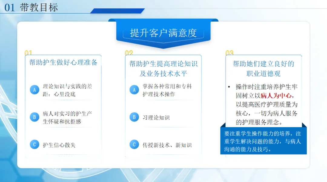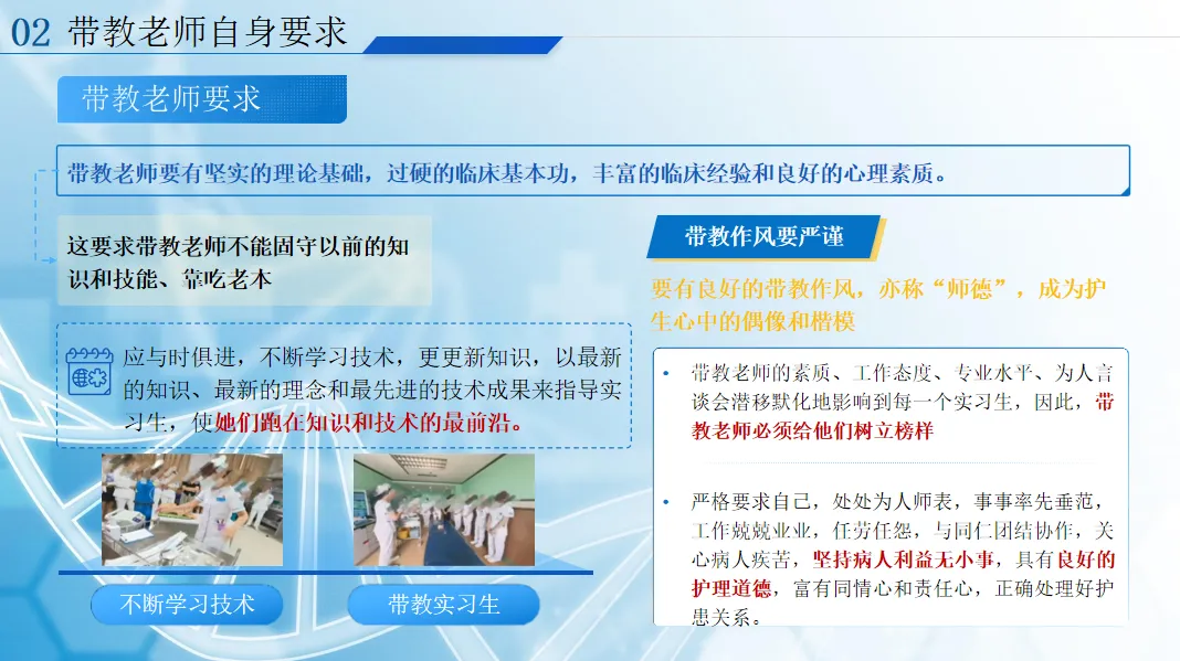 做好带教,首先要明确带教目标,核心就是帮护生做好心理过渡、夯实理论与操作能力、树立良好的职业观,让她们从内心认可护理工作,真正做到以病人为中心。而带教老师的自身要求,是带教的根本:不仅要有扎实的理论、过硬的临床技能,还要与时俱进不断学习,更要作风严谨、为人师表,用自己的责任心、同情心,给护生树立最好的榜样,同时以评判性思维带教,耐心指导护生的每一个不足。