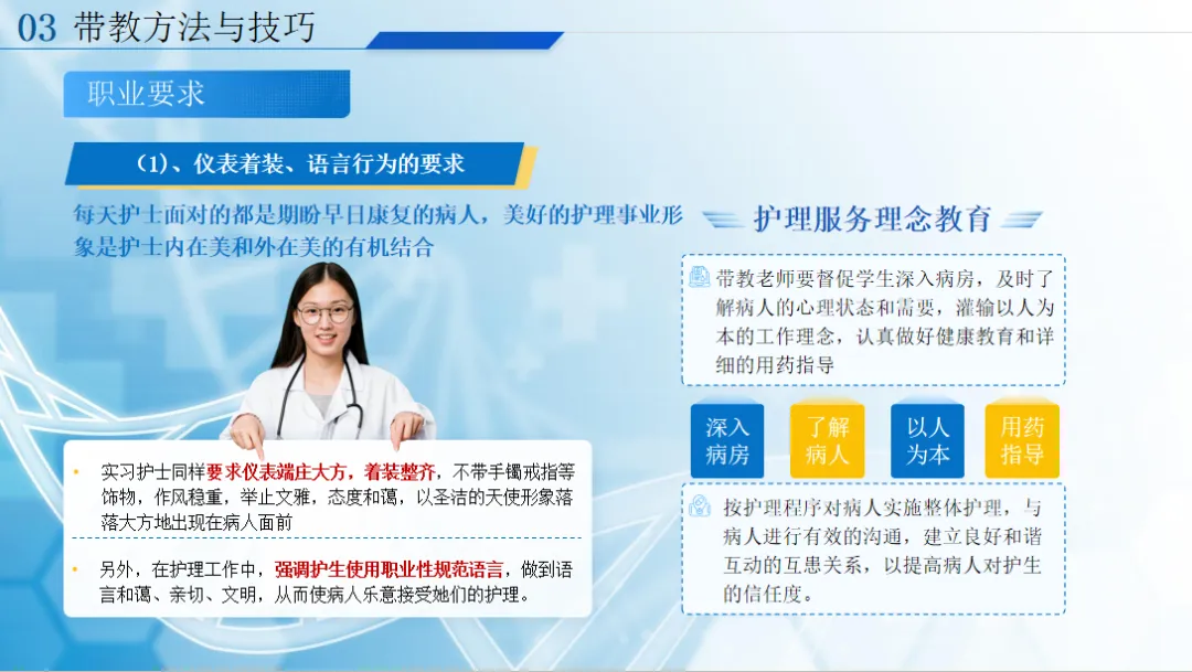带教有方法,技巧很重要。首先要做好护生的职业规范教育,从仪表着装到沟通语言,教会她们以专业的形象面对患者;其次要制定科学的带教计划,入科第一天做好环境和制度讲解,消除护生陌生感,实行 “一对一” 带教,操作上先讲解、再示范、后指导,多给实操机会,同时强调护理记录的规范性和法律意识,让护生牢记核心制度,培养慎独精神;最后做好终末考核,全面检验学习成果,客观填写实习鉴定。